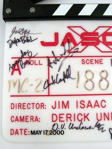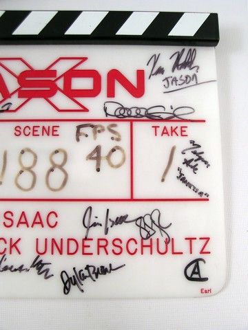 The massively successful "Friday the 13th" franchise took a futurist turn in 2001 with "Jason X", in which the monster Jason Voorhees comes to life on a spaceship in the 25th Century! This is an actual production used clapboard from the movie, signed my a whole slew of Cast and Crew members including James Isaac (Director) , Kane Hodder (Jason Voorhees), Dylan Blerk (Briggs), Amanda Brugel (Geko), Chuck Campbell (Tsunaron), Robert A. Silverman (Dieter Perez), Melyssa Ade (Janessa), and Derick V. Underschultz (Director of Photography). Board still has the original Roll, Scene and Take information, and is the official custom made Jason X board with Director and Camera inscribed. It is dated May 17, 2000. Clapboard is 11"x9.5".