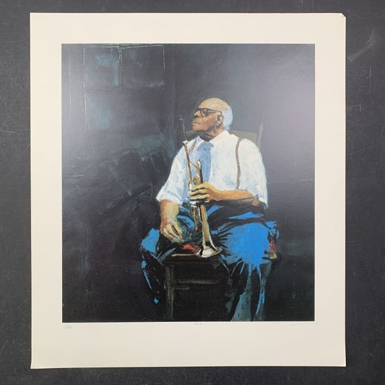 Jason's "Solo" Limited Edition Print. A jazz musician sits in his chair while preparing for his upcoming solo. This piece is signed in the lower right, numbered 215/550 in the lower left and titled in the lower middle. It has minor dog-ears but will not be seen once framed. It is in very good condition.