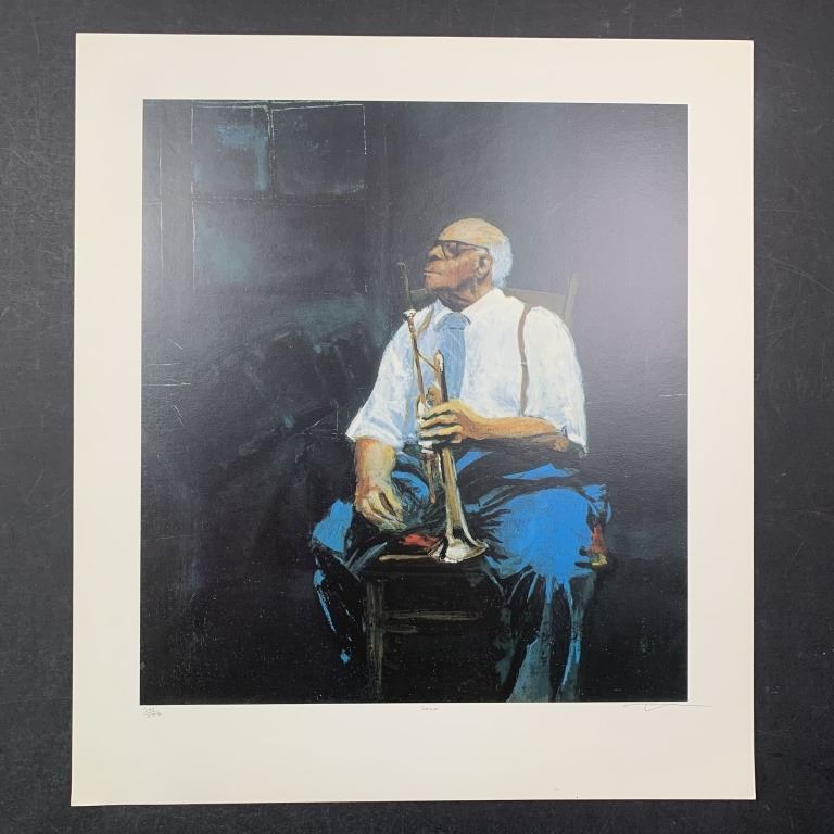 Jason's "Solo" Limited Edition Print. A jazz musician sits in his chair while preparing for his upcoming solo. This piece is signed in the lower right, numbered 245/550 in the lower left and titled in the lower middle. It is in excellent condition.