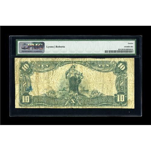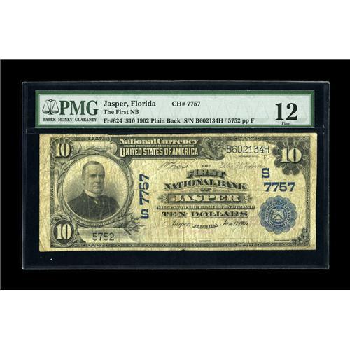 <B>Jasper, FL</B></I> - $10 1902 Plain Back Fr. 624 <B>The First NB</B></I> Ch. # (S)7757<BR>A very rare note from the only bank to issue in this tiny north Florida community. Small notes are still unreported from this institution, leaving collectors only the three large examples in the census, which includes this piece, to complete a Florida collection by town or county. PMG has graded this piece as <B>Fine 12.</B></I><BR><BR><b>Shipping:</b> Coin/Currency (<a target="_blank" href="http://www.heritageauctions.com/common/shipping.php">view shipping information</a>)