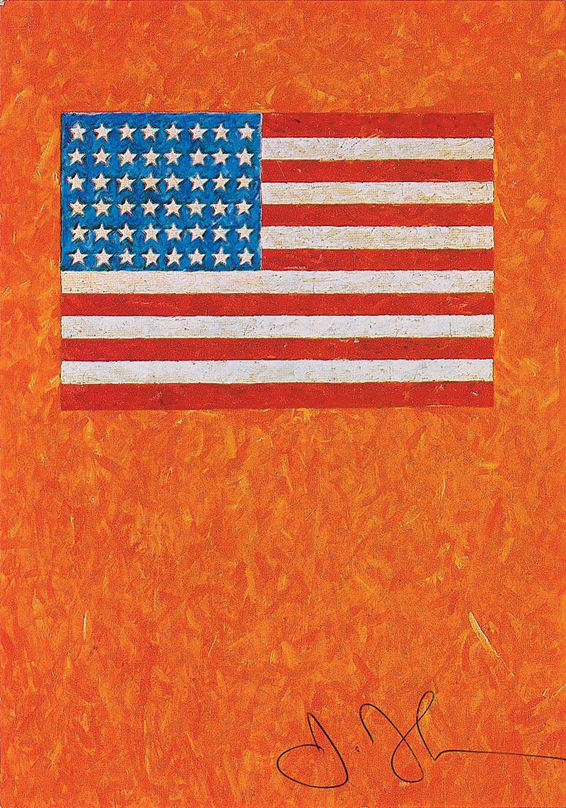 Color postcard of Johns’s 1957 work entitled ‘Flag on Orange Field,’ 4 x 5.75, signed at the bottom in black ink. In fine condition.