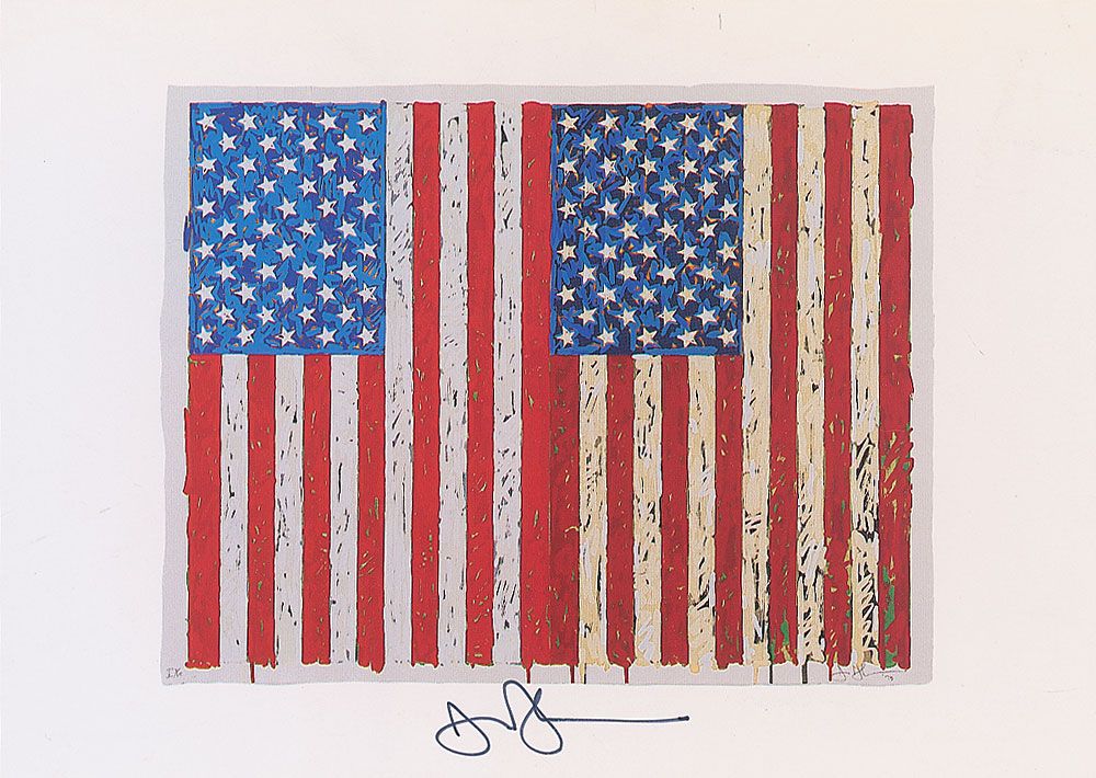 Color postcard of Johns’s 1973 work entitled ‘Flags,’ 7 x 5, signed in the lower border in black felt tip. In very fine condition.