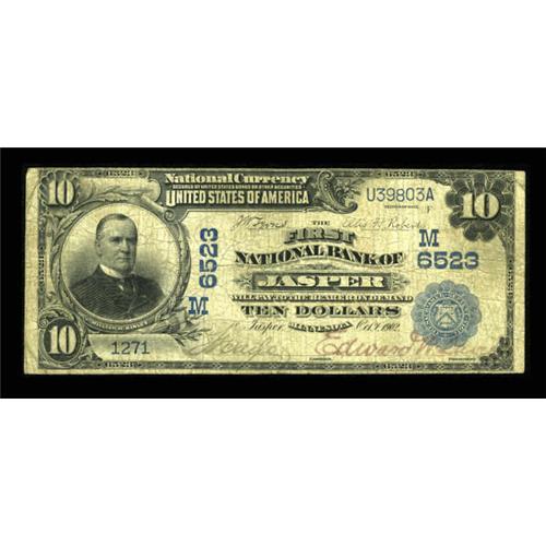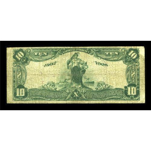 <B>Jasper, MN </B></I>- $10 1902 Date Back Fr. 616 <B>The First NB</B></I> Ch. # (M)6523<BR> Large notes only from this very scarce bank, with the population standing at just seven pieces. This specimen is new to the census. <B>Very Good+,</B></I> with two color signatures. <BR><BR><b>Shipping:</b> Coins & Currency (<a target="_blank" href="http://www.heritageauctions.com/common/shipping.php">view shipping information</a>)