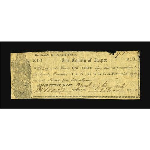 Jasper, TX- Jasper County $10 April 19, 1862 Medlar 4An