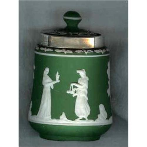In Excellent condition. A Medium green colored jampot with a hole in the lid for a jam spoon.4.1/4" to top of knop on lid. 3>1/2" across at the widest part. Silver plated "collar" to jar. Classical ladies decoration. Circa 1920. Incised mark on the base "c407"