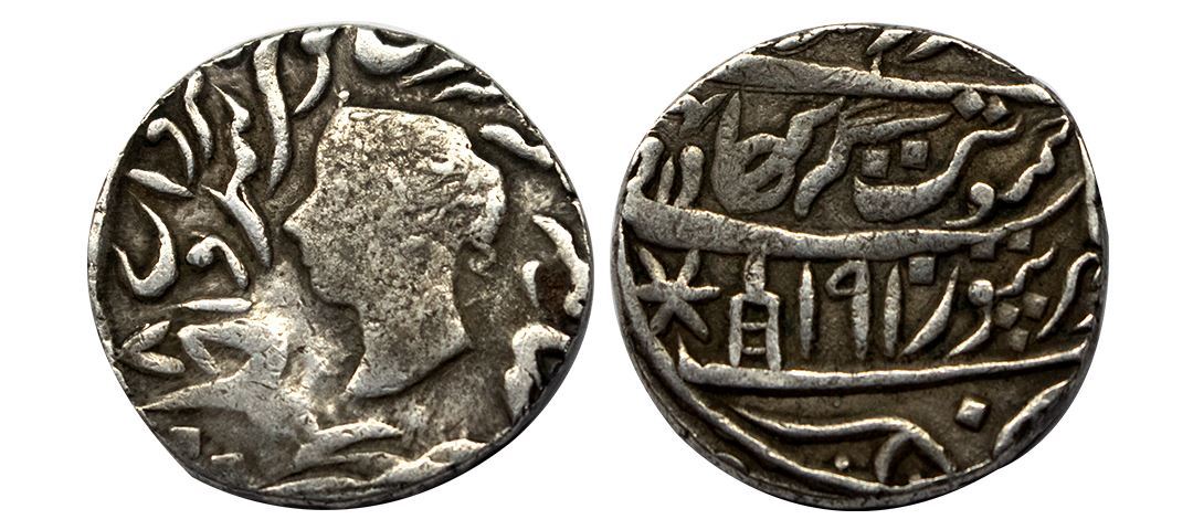 Jaswant Singh (AH 1269-1311; 1853-1893 AD, Silver Rupee, 11.04g, Bharatpur Mint, with the name and portrait of Queen Victoria, VS 1910, with star and katar (dagger) on rev. (KM 156). Very Fine+, Rare.