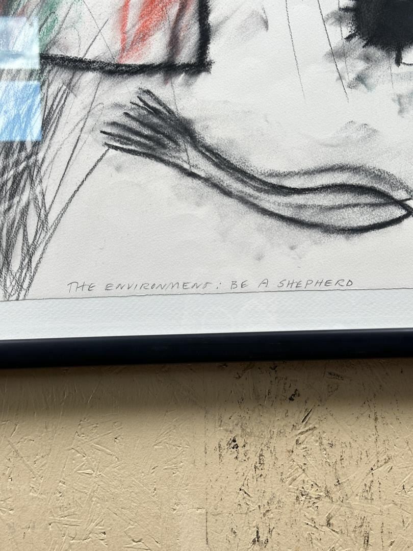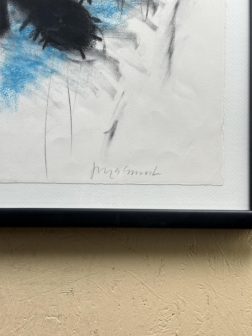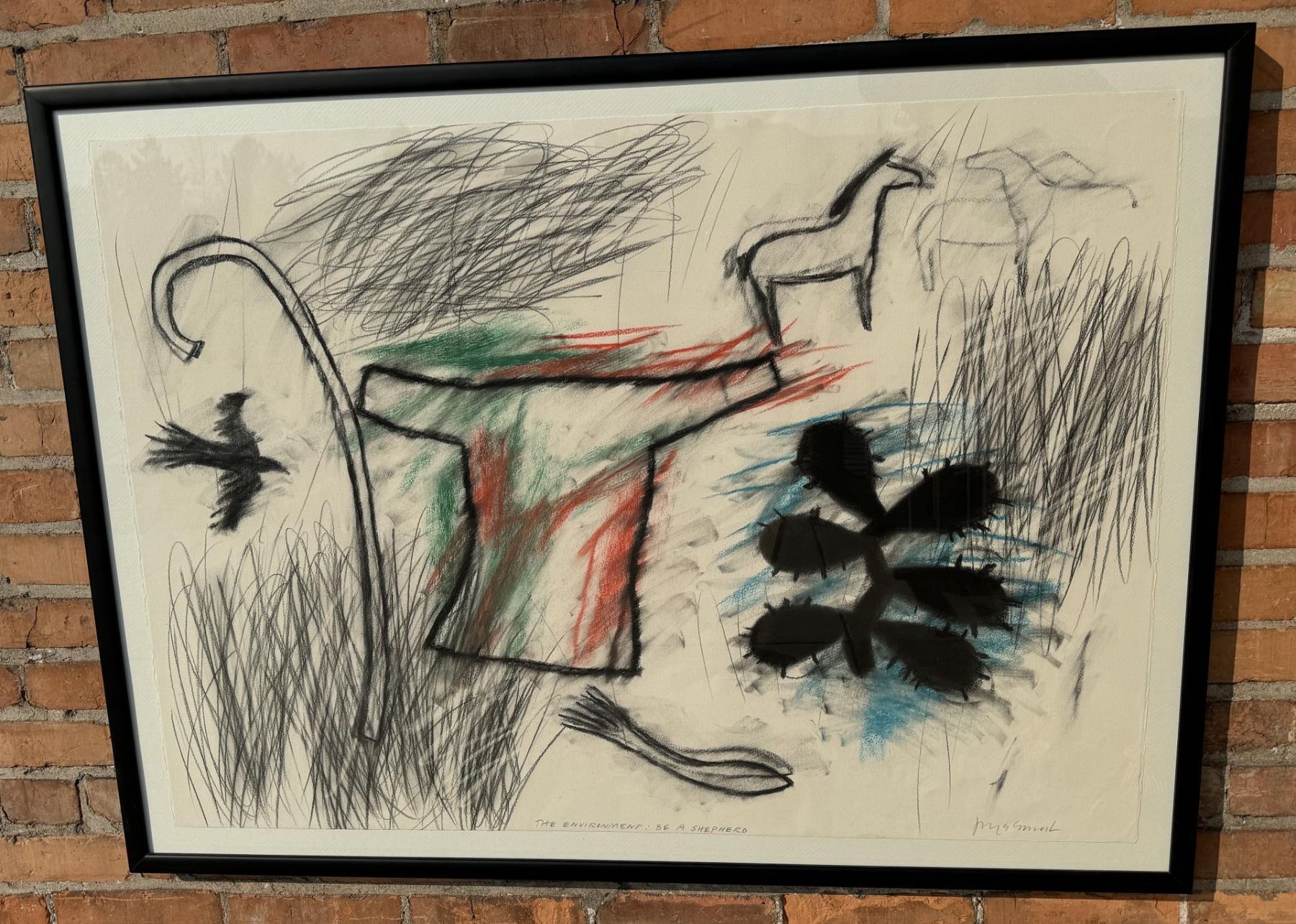 Title is The Environment: Be a Shepherd. 34" by 46" framed. Provenance Tootie Myhre Bigfork Montana Estate. Carol Tootie Myhre grew up in Olympia, WA where she became an excellent golfer, a sport she continued to enjoy. After graduation from Western Washington State College, she worked at the Montana School for the Deaf and Blind. Tootie and the late Eric Myhre, a Montana advertising executive, shared a passion for art and fine things. They had an extensive collection of fine art and incorporated it into their daily living between Bigfork Montana and Carefree Arizona. Jaune Quick-To-See Smith (Born 1940) is active/lives in New Mexico, Montana. Jaune Smith is known for Modernist Indian figure-genre painting. Jaune Quick-to-See Smith, of Salish, French-Cree and Shoshone ancestry, was born on the Flathead Indian Reservation in St. Ignatius, Montana in 1940. The daughter of an amateur painter, her pastels and paintings depict her memories of childhood landscapes, her horse, "Cheyenne," appearing in many of her works. She studied at Framingham State College, Massachusetts, earning a B.A. degree in Art Education in 1976, and the University of New Mexico, M.F.A., Art, 1980. She now lives in Corrales, New Mexico. Smith became an artist while in her 30s, and was earning a living as a painter before she completed her degree at the University of New Mexico. By the mid-1970s, Smith had also founded artists' groups, curated exhibitions, and organized grassroots protests to express her concern for the land and its people. Smith creates work that addresses the myths of her ancestors in the context of current issues facing American Indians. She works with paint, collage, and appropriated imagery, using a combination of representational and abstract images. Inspired by the formal innovations of such artists as Pablo Picasso, Paul Klee, and Robert Rauschenberg, as well as traditional American Indian art, Smith sees herself as "a harbinger, a mediator and a bridge builder. My art, my life experience, and my tribal ties are totally enmeshed. I go from one community with messages to the other, and I try to enlighten people." The artist's awards include: Purchase Award, Academy of Arts and Letters, New York City, 1987; Distinguished Service Award, Salish Kootenai College, Montana 1991; SITE Santa Fe Award, 1995; Joan Mitchell Foundation Award, 1996; Lifetime Achievement Award, Women's Caucus for the Arts, 1997; Honorary Doctorates at Minneapolis College of Art and Design 1992; Pennsylvania Academy of the Fine Arts, Philadelphia 1998; Eiteljorg Fellowship, 1999. Her one-person show, "Subversion/Affirmation: Jaune Quick-to-See Smith, A Survey," originated at the Jersey City Museum, concluding its national tour in 1998 at the Art Museum of Missoula, Montana. Other solo exhibitions include: The Neuberger Museum; Smith College; The Chrysler Museum, Lehigh University; New Mexico State University Museum. Smith's group exhibits include: The Decade Show, NY; Myth and Magic in the Americas, Museo de Arte Comtemporaneo de Monterrey, Mexico; The IV South American Biennial; Stephane Janssen Collection; Kaleidoscope Show, the National Museum of American Art, Washington, DC; World Views: Maps & Art, the Weisman Art Museum, Minneapolis; Ceremonial, the Venice Biennale; The View from Here, State Tretyakov Gallery, Moscow, Russia.Italic Smith's work is in numerous public collections, including; Museum of Mankind, Vienna, Austria; National Museum of Women in the Arts, DC; Minneapolis Institute of Arts; Smith College, Massachusetts; Walker Art Center, Minneapolis; Jersey City Museum; Chrysler Art Museum, Virginia; High Museum, Atlanta; National Museum of American Art, Washington, DC; Museum of Modern Art, and Whitney Museum of American Art, New York City. PUBLICATIONS: The Pink Glass Swan; Partial Recall and Mixed Blessings by Lucy Lippard; Art History by Marilyn Stokstad; Women Artists: Works from the National Museum of Women in the Arts by Nancy Heller; Women, Art and Society by Whitney Chadwick; Native American Identities by Scott Vickers; Mapping the Terrain: New Genre Public Art by Suzanne Lacy and Printmaking in New Mexico 1880-1990 by Clinton Adams. Smith has been featured in six PBS broadcasts, several German ZDF films and a Finnish documentary. Her work has been reviewed in Art in America, Village Voice, Art Forum, Art News, The New Art Examiner, Art Week, The New York Times and Art Papers. SELECTED PUBLIC COMMISSIONS: Commissions include the Ridgedale Library Mural, (12' X 24'), Hennepin County, MN in 1999; West Seattle AIki Beach Trail, team, memorial markers and art installations, 1996; National Museum of the American Indians, Smithsonian Institution, Washington, DC, artist on design team, 1993; Northwind Fishing Weir Story, Fish Wheel Project, collaboration with Duwamish Tribe, King County Arts Commission, Seattle, WA, 1992; Yerba Buena Park, Sculpture Garden, Moscone Center, San Francisco, CA, Cultural Museum, Flathead Reservation, MT, designed floor, New Denver Airport, Terrazzo Floor, Main Terminal, Wastewater Treatment Plant, Series of Installations for Public Tour, Phoenix, AZ , 1991; Washington State Arts Commission, Public Schools Art Program, 1990; Salt River Utilities Headquarters, Phoenix, AZ, 1989; The Palms Hotel, Phoenix, AZ, 1985; Phelps Dodge Corporation Headquarters, Phoenix, AZ, 1983. LECTURES: Smith has lectured at over 175 universities, museums and conferences internationally. She has delivered keynote addresses to many annual art education conferences as well as the National Art Education Association's National Conference and the Women's Caucus for the Arts National Conference. PRINTMAKING: Smith has printed at workshops nationwide including RCIPP, Rutgers University in New Brunswick, NJ; Tandem Press, Madison, WI; Washington Univ., St. Louis, MO; Lawrence Lithography Workshop, Kansas City, KS; and Tamarind Institute, Albuquerque, NM. BOARDS: The Institute of American Indian Arts, Santa Fe; Ameri