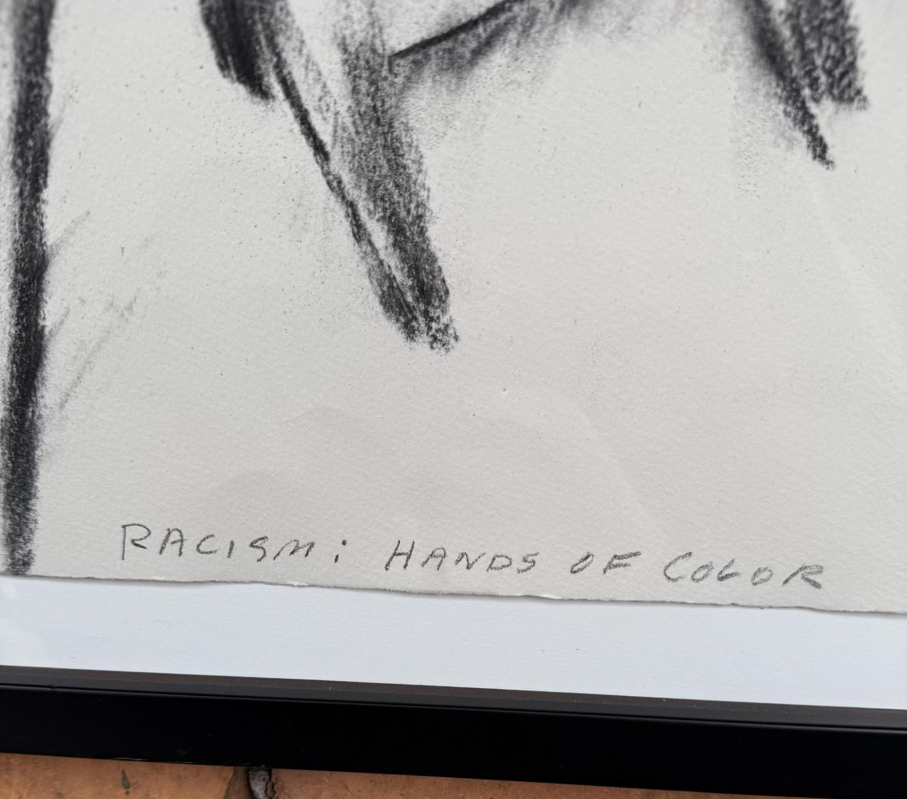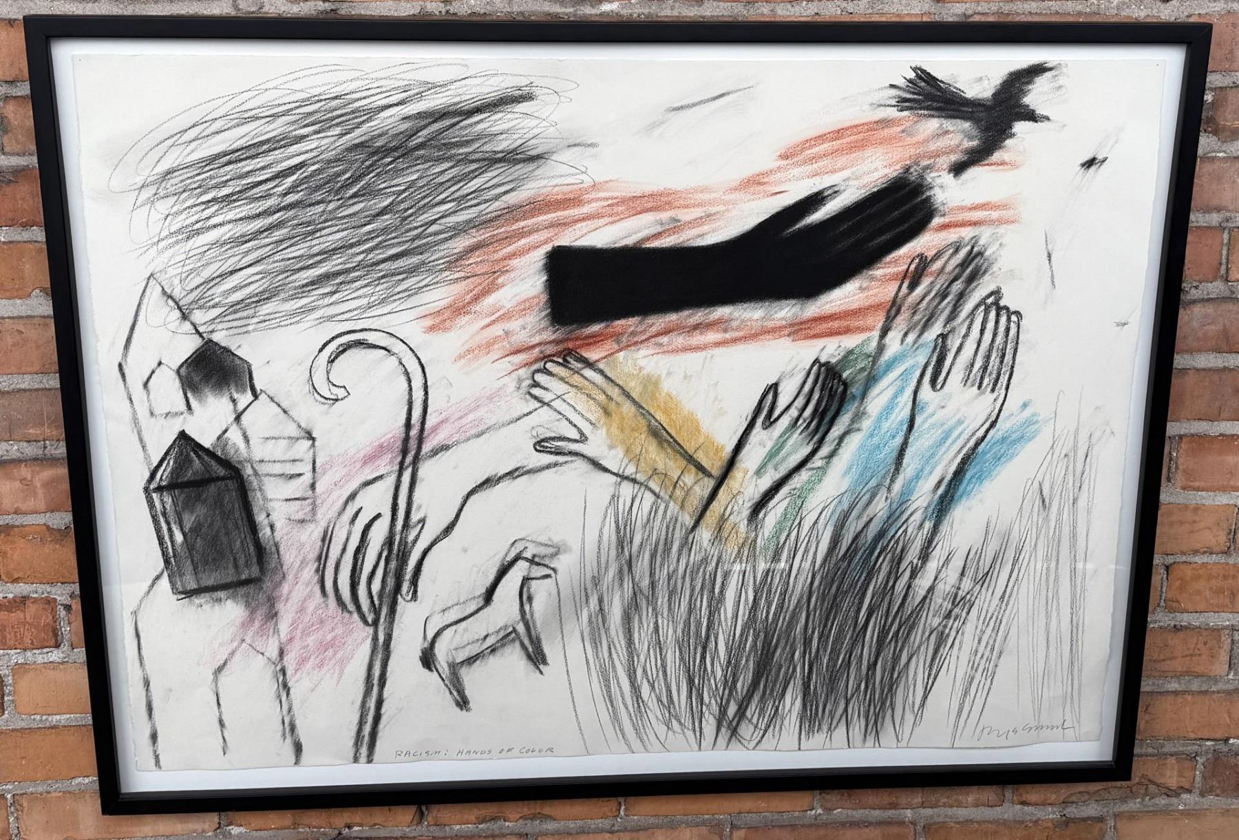 Title is Racism: Hands of Color. 32 1/2" by 43 1/2" framed. Mixed Media on Paper. Provenance Tootie Myhre Bigfork Montana Estate. Carol Tootie Myhre grew up in Olympia, WA where she became an excellent golfer, a sport she continued to enjoy. After graduation from Western Washington State College, she worked at the Montana School for the Deaf and Blind. Tootie and the late Eric Myhre, a Montana advertising executive, shared a passion for art and fine things. They had an extensive collection of fine art and incorporated it into their daily living between Bigfork Montana and Carefree Arizona. Jaune Quick-To-See Smith (1940 - 2025) was active/lived in New Mexico, Montana. Jaune Smith is known for Modernist Indian figure-genre painting. Jaune Quick-to-See Smith, of Salish, French-Cree and Shoshone ancestry, was born on the Flathead Indian Reservation in St. Ignatius, Montana in 1940. The daughter of an amateur painter, her pastels and paintings depict her memories of childhood landscapes, her horse, "Cheyenne," appearing in many of her works. She studied at Framingham State College, Massachusetts, earning a B.A. degree in Art Education in 1976, and the University of New Mexico, M.F.A., Art, 1980. She now lives in Corrales, New Mexico. Smith became an artist while in her 30s, and was earning a living as a painter before she completed her degree at the University of New Mexico. By the mid-1970s, Smith had also founded artists' groups, curated exhibitions, and organized grassroots protests to express her concern for the land and its people. Smith creates work that addresses the myths of her ancestors in the context of current issues facing American Indians. She works with paint, collage, and appropriated imagery, using a combination of representational and abstract images. Inspired by the formal innovations of such artists as Pablo Picasso, Paul Klee, and Robert Rauschenberg, as well as traditional American Indian art, Smith sees herself as "a harbinger, a mediator and a bridge builder. My art, my life experience, and my tribal ties are totally enmeshed. I go from one community with messages to the other, and I try to enlighten people." The artist's awards include: Purchase Award, Academy of Arts and Letters, New York City, 1987; Distinguished Service Award, Salish Kootenai College, Montana 1991; SITE Santa Fe Award, 1995; Joan Mitchell Foundation Award, 1996; Lifetime Achievement Award, Women's Caucus for the Arts, 1997; Honorary Doctorates at Minneapolis College of Art and Design 1992; Pennsylvania Academy of the Fine Arts, Philadelphia 1998; Eiteljorg Fellowship, 1999. Her one-person show, "Subversion/Affirmation: Jaune Quick-to-See Smith, A Survey," originated at the Jersey City Museum, concluding its national tour in 1998 at the Art Museum of Missoula, Montana. Other solo exhibitions include: The Neuberger Museum; Smith College; The Chrysler Museum, Lehigh University; New Mexico State University Museum. Smith's group exhibits include: The Decade Show, NY; Myth and Magic in the Americas, Museo de Arte Comtemporaneo de Monterrey, Mexico; The IV South American Biennial; Stephane Janssen Collection; Kaleidoscope Show, the National Museum of American Art, Washington, DC; World Views: Maps & Art, the Weisman Art Museum, Minneapolis; Ceremonial, the Venice Biennale; The View from Here, State Tretyakov Gallery, Moscow, Russia.Italic Smith's work is in numerous public collections, including; Museum of Mankind, Vienna, Austria; National Museum of Women in the Arts, DC; Minneapolis Institute of Arts; Smith College, Massachusetts; Walker Art Center, Minneapolis; Jersey City Museum; Chrysler Art Museum, Virginia; High Museum, Atlanta; National Museum of American Art, Washington, DC; Museum of Modern Art, and Whitney Museum of American Art, New York City. PUBLICATIONS: The Pink Glass Swan; Partial Recall and Mixed Blessings by Lucy Lippard; Art History by Marilyn Stokstad; Women Artists: Works from the National Museum of Women in the Arts by Nancy Heller; Women, Art and Society by Whitney Chadwick; Native American Identities by Scott Vickers; Mapping the Terrain: New Genre Public Art by Suzanne Lacy and Printmaking in New Mexico 1880-1990 by Clinton Adams. Smith has been featured in six PBS broadcasts, several German ZDF films and a Finnish documentary. Her work has been reviewed in Art in America, Village Voice, Art Forum, Art News, The New Art Examiner, Art Week, The New York Times and Art Papers. SELECTED PUBLIC COMMISSIONS: Commissions include the Ridgedale Library Mural, (12' X 24'), Hennepin County, MN in 1999; West Seattle AIki Beach Trail, team, memorial markers and art installations, 1996; National Museum of the American Indians, Smithsonian Institution, Washington, DC, artist on design team, 1993; Northwind Fishing Weir Story, Fish Wheel Project, collaboration with Duwamish Tribe, King County Arts Commission, Seattle, WA, 1992; Yerba Buena Park, Sculpture Garden, Moscone Center, San Francisco, CA, Cultural Museum, Flathead Reservation, MT, designed floor, New Denver Airport, Terrazzo Floor, Main Terminal, Wastewater Treatment Plant, Series of Installations for Public Tour, Phoenix, AZ , 1991; Washington State Arts Commission, Public Schools Art Program, 1990; Salt River Utilities Headquarters, Phoenix, AZ, 1989; The Palms Hotel, Phoenix, AZ, 1985; Phelps Dodge Corporation Headquarters, Phoenix, AZ, 1983. LECTURES: Smith has lectured at over 175 universities, museums and conferences internationally. She has delivered keynote addresses to many annual art education conferences as well as the National Art Education Association's National Conference and the Women's Caucus for the Arts National Conference. PRINTMAKING: Smith has printed at workshops nationwide including RCIPP, Rutgers University in New Brunswick, NJ; Tandem Press, Madison, WI; Washington Univ., St. Louis, MO; Lawrence Lithography Workshop, Kansas City, KS; and Tamarind Institute, Albuquerque, NM. BOARDS: The Institute of American Ind