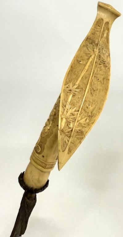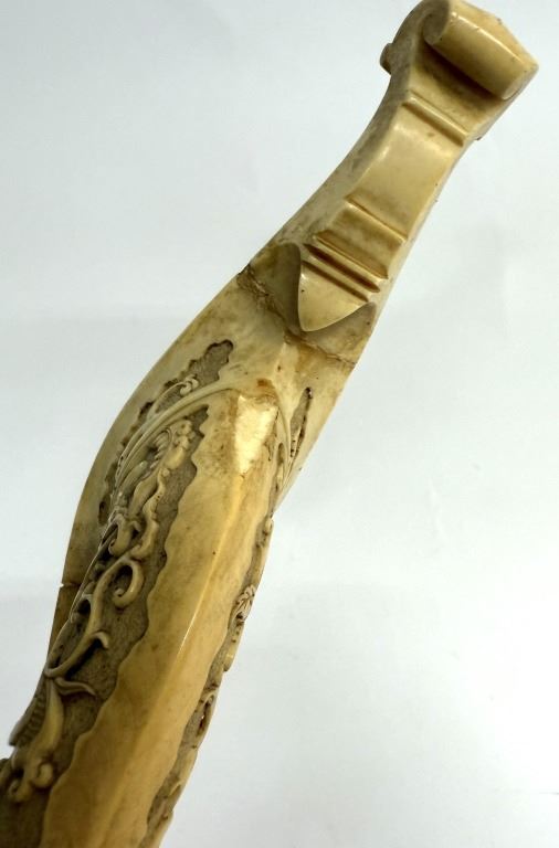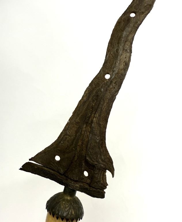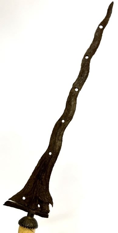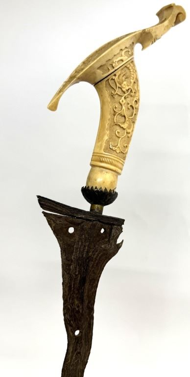 Item/Description: Javanese Indonesian Keris, a traditional ceremonial spiritual dagger and sacred heirloom weapon. Handle made of ox bone/horn intricately carved with nature motifs. Iron blade pierced with circular holes. Origin of circular holes is unclear. (Kris, Ngeris, Java, Indonesia, Southeast Asian)