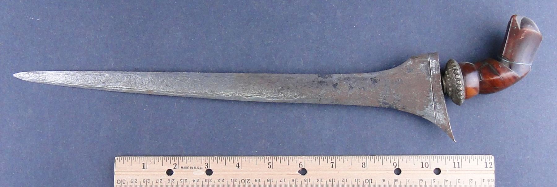 Description: The Javanese or Indonesian kris is a hand-forged, magic dagger with an undulating or straight blade. In times past, no Javanese would go anywhere without his kris, and it was an essential part of the groom's outfit at weddings. In Borneo krises were part of bride price. This lot has an antique straight kris with 17-1/2" blade and wooden handle, and a scabbard for another kris, about 12" long. See Quiggin, pp. 256-57, and Opitz, p. 188-89.