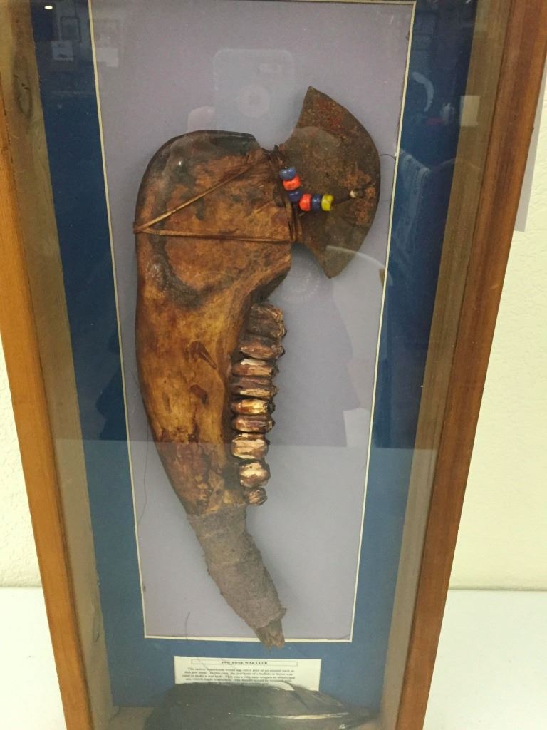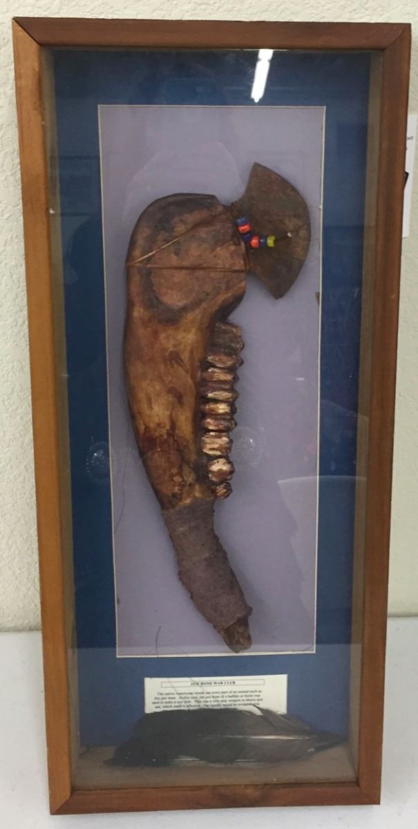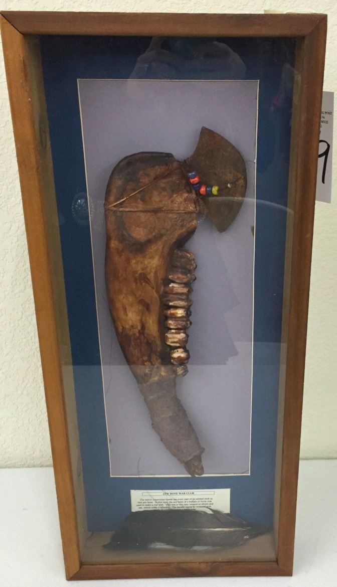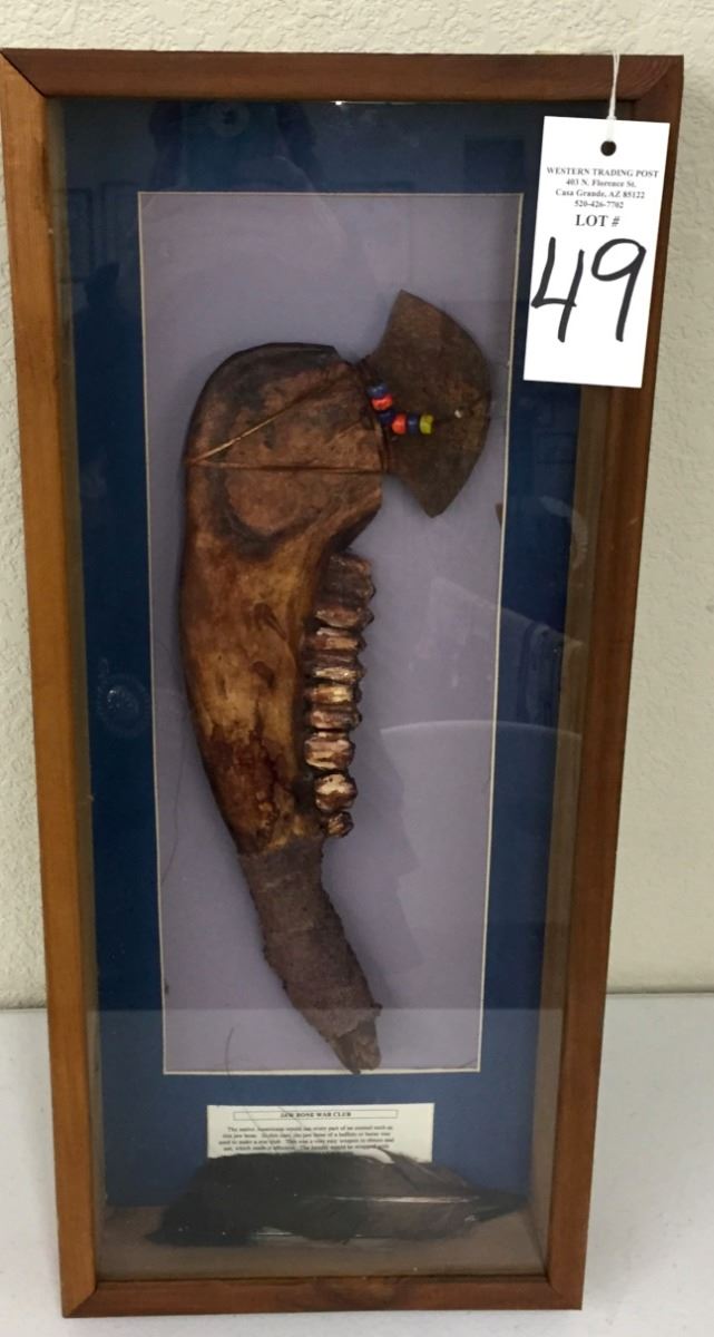 This vintage jaw bone war club display is nicely framed in a shadowbox which measures 11” wide by 24.5” tall and 3” deep. Please look closely at the pics as they are an important part of our description. Shipping: There will be a $10 handling / packaging fee for shipping this lot. The actual cost of postage will be added on top of that.