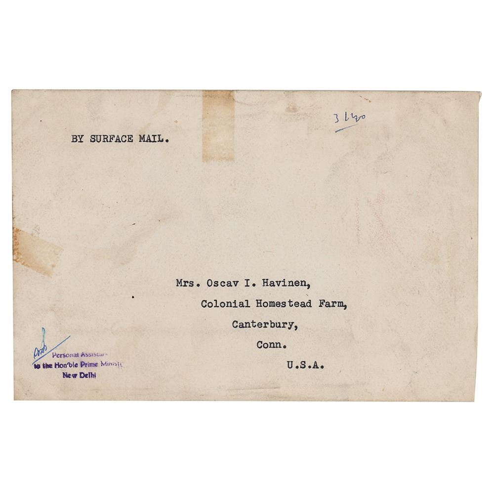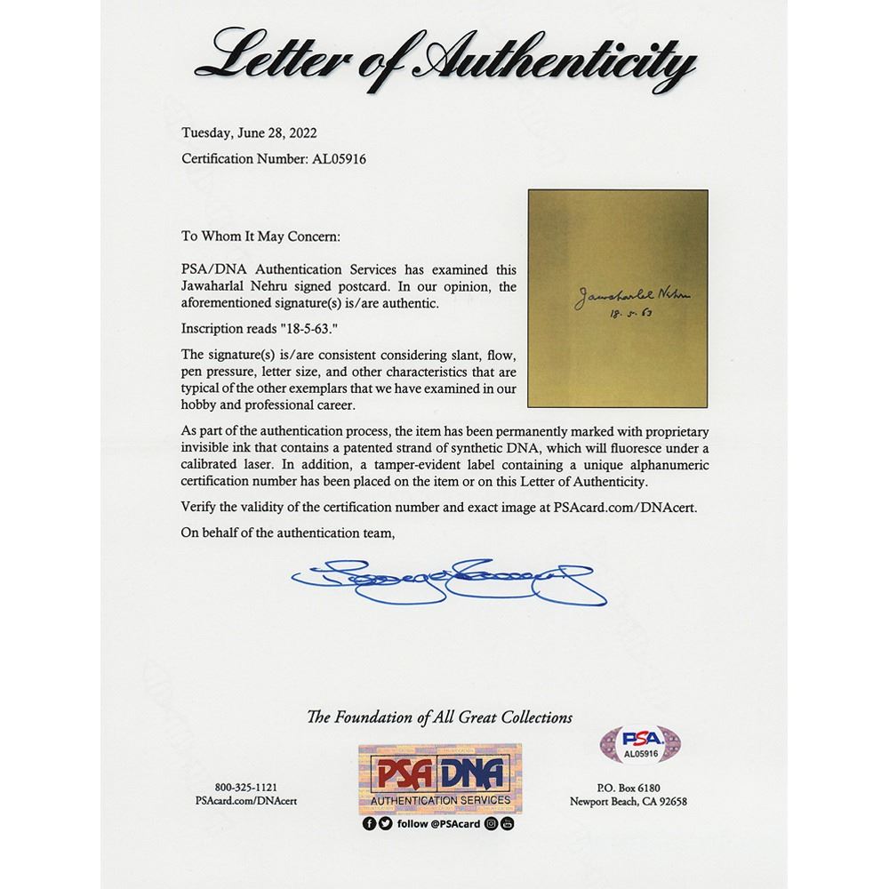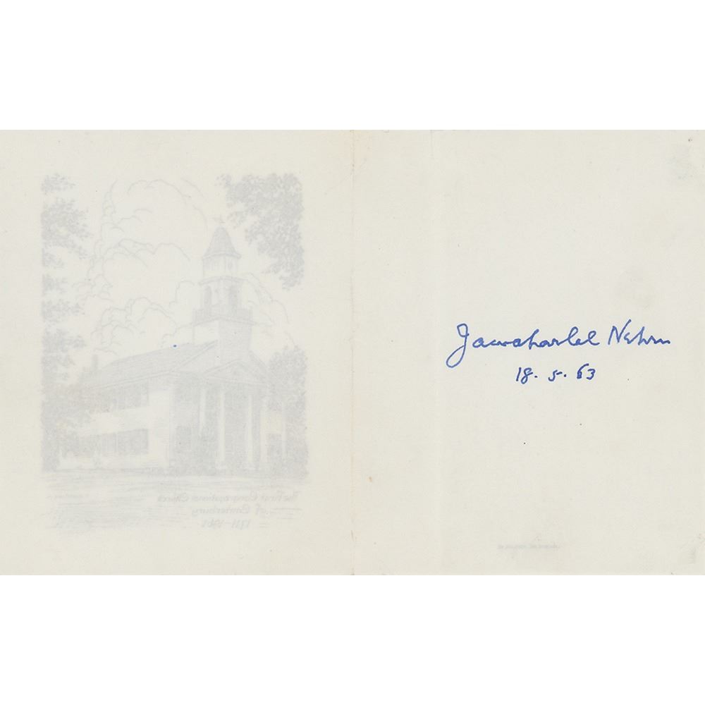 Fountain pen signature, "Jawaharlal Nehru, 18.5.63,” inside an off-white 4 x 5 leaflet depicting the First Congregational Church of Canterbury on the front. In fine condition, with a light vertical fold to the left of the signature. Accompanied by a full letter of authenticity from PSA/DNA. Accompanied by the original mailing envelope.
