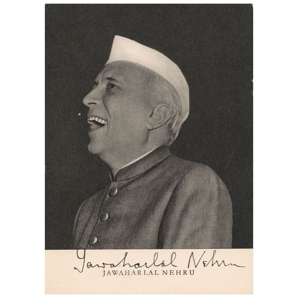 Appealing 4 x 5.75 signed German postcard photo of the Indian prime minister, signed in the lower border in black felt tip, "Jawaharlal Nehru." fine condition.