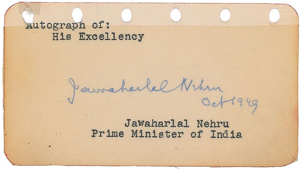 Vintage ink signature, “Jawaharlal Nehru, Oct. 1949,” an off-white 4.5 x 2.5 page. In very good condition, with toning to borders and a clear piece of tape affixed over the entire page.