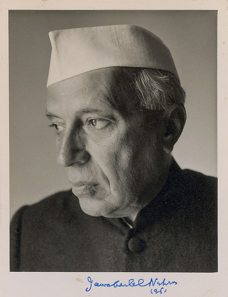 Matte-finish 4.75 x 6.25 head-and-shoulders photo of the Indian prime minister, signed in the lower border in blue ink, “Jawaharlal Nehru, 1961.” A crease passing through the forehead area and a few tiny stains to borders, otherwise fine condition.