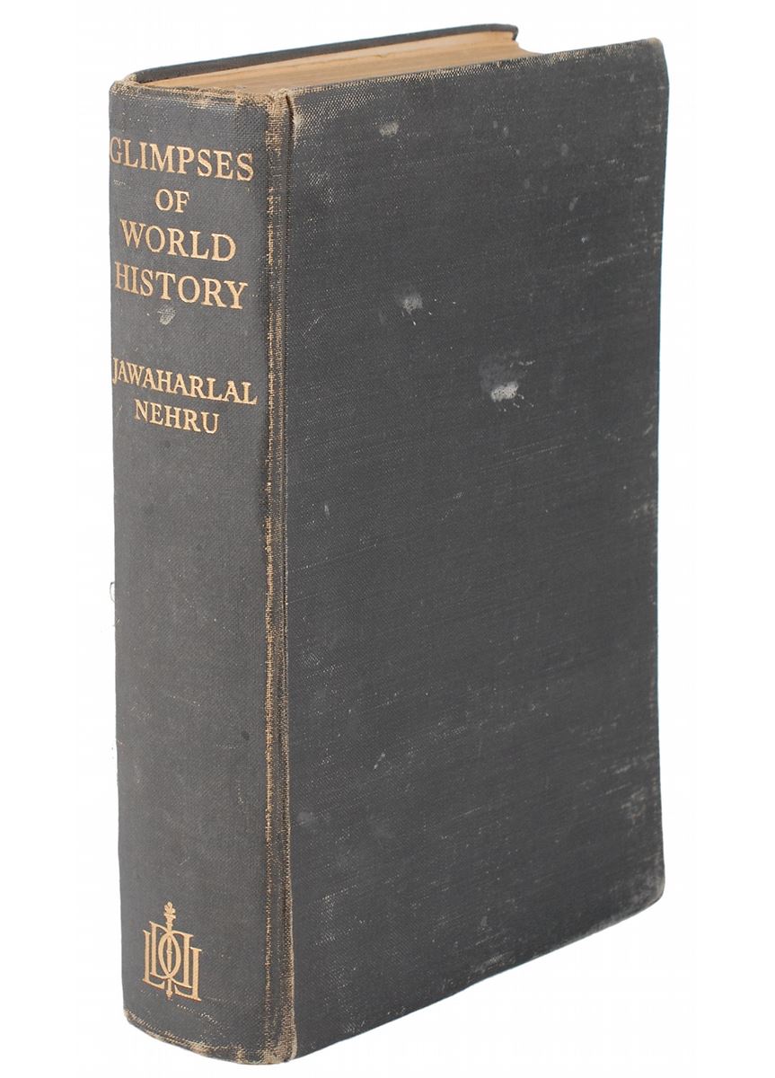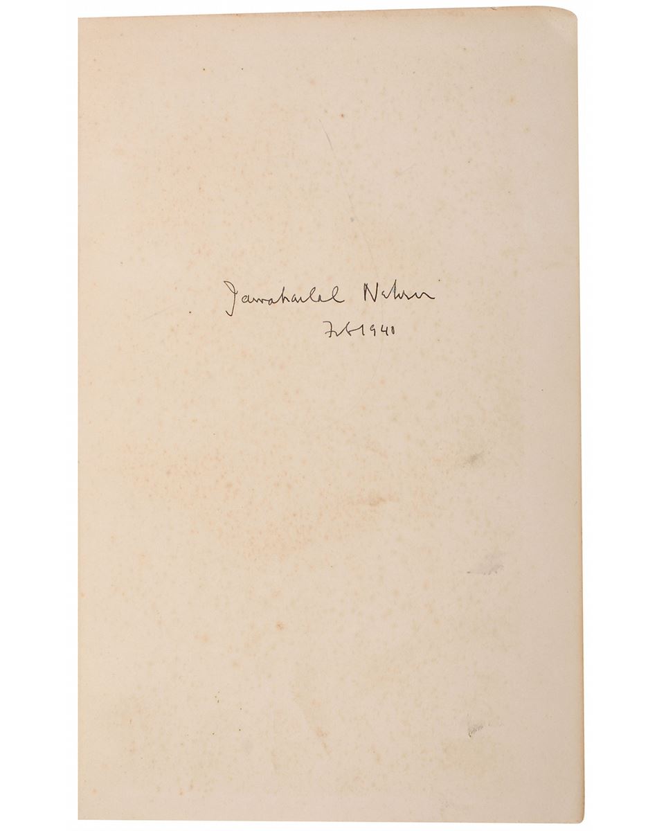 Signed book: Glimpses of World History. Later printing. London: Lindsay Drummond Limited, 1939. Hardcover, 5.5 x 8.75, 993 pages. Signed on the first free end page in black ink, “Jawaharlal Nehru, Feb 1941.” In very good condition, with a few stray ink marks and foxing to signed page, tears and tape repairs to title and index pages, cracked hinges (binding loose), and scattered wear to covers and spine.