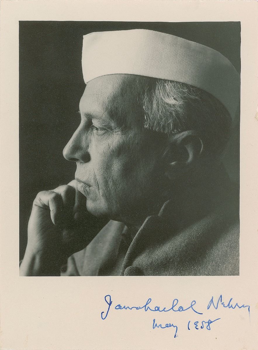 Satin-finish 6 x 8 photo of Nehru in near-profile, signed in the lower border in blue ink, “Jawaharlal Nehru, May 1958.” In fine condition.
