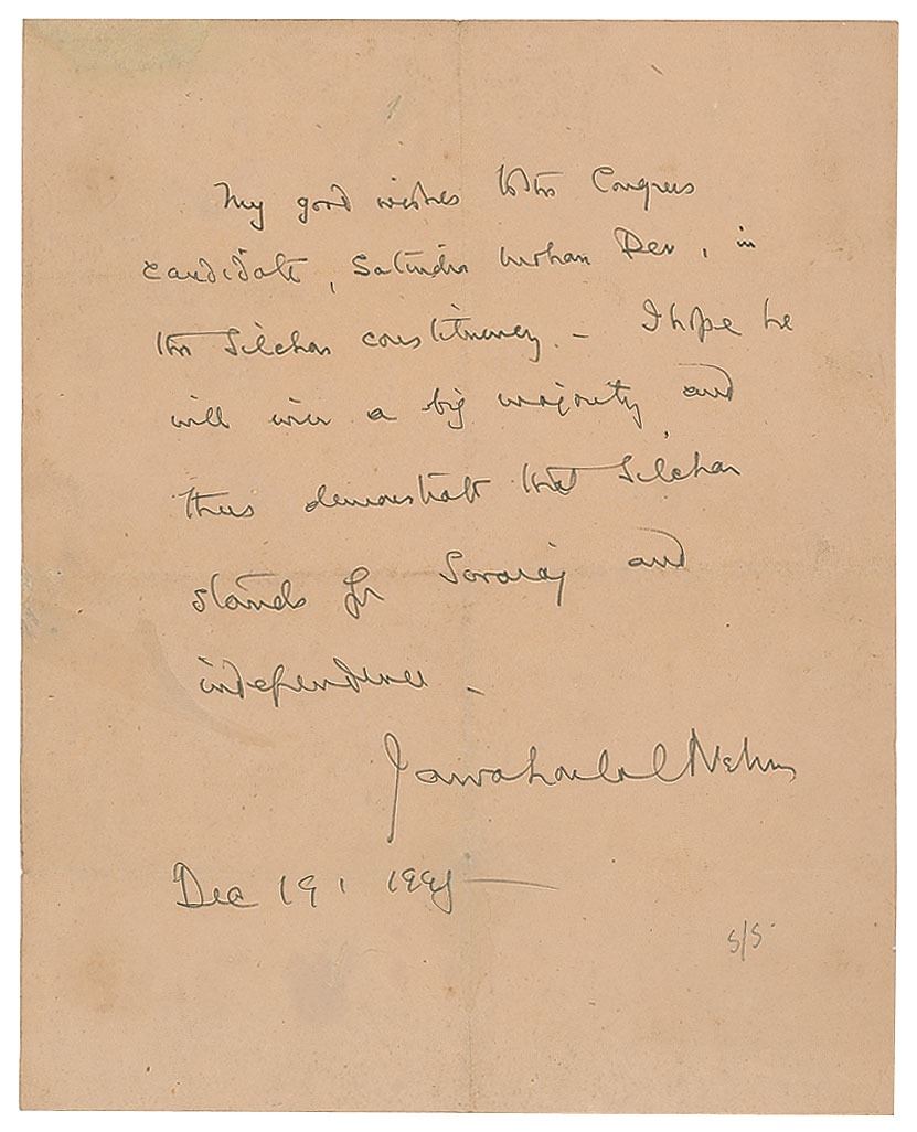 ALS, one page, 6.75 x 8.5, December 19, 1948. Letter of endorsement written while Nehru was interim Prime Minister and deeply involved in trying to create union in the most challenging areas of India. In part: "My good wishes to the Congress candidate, Satindra Mohan Dev, in the Silchar constituency. I hope he will win a big majority and thus demonstrate that Silchar stands for…and independence." In very good to fine condition, with light creasing, soiling, and intersecting folds. Satindra Mohan Dev was a renowned Bengali Northeastern Freedom Fighter. He was a fierce opponent of British Rule and was jailed a number of times by the British for his resistance activities. His son, Santosh Mohan Dev, was a veteran Indian political leader. A member of the Dev family has occupied an elected office from South Assam for all but 10 years since Indian Independence.