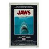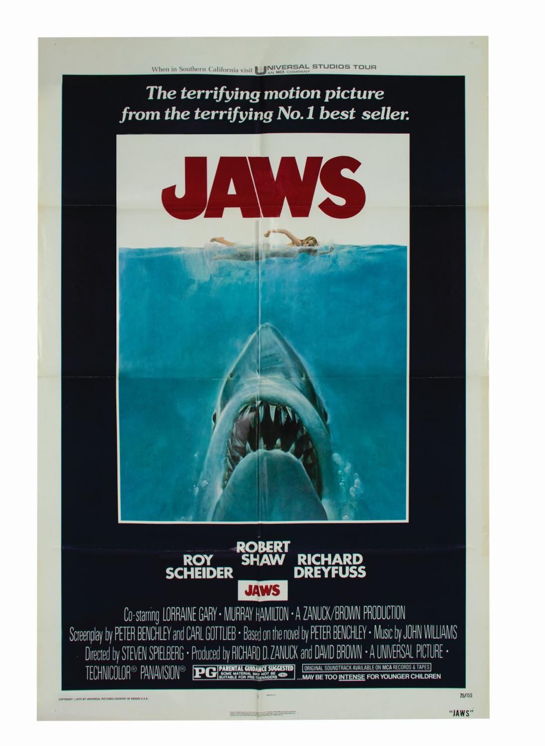 (Universal, 1975) An original U.S. 1-sheet poster for the first summer blockbuster, Jaws. Director Steven Spielberg's horror classic has cursed generations of movie goers with a terror of swimming in the ocean, and Roger Kastel's poster art provides one of the most iconic and vivid evocations of that phobia. Folded as issued, the poster measures 41"x27" and is in fine condition with a 10.25"x0.5" strip of light brown toning at the far edge of the lower right margin, and a small cluster of brown spots in the margin at lower right.