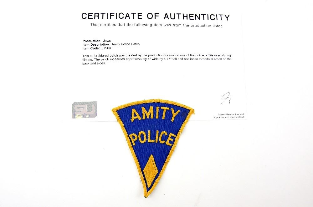 Jaws (1975) - ‘Amity Police’ Uniform Patch.Triangular cotton costume patch, bearing ‘Amity Police’ embroidered centrally, & exhibiting signs of minor wear. The patch would have been attached to the upper sleeve of the Amity Police uniforms; a fictional department lead by Chief of Police Martin Brody (played by Roy Scheider). Provenance: With Certificate of Authenticity from Screenused. According to Screenused this piece was sourced directly from a member of the Production Crew.