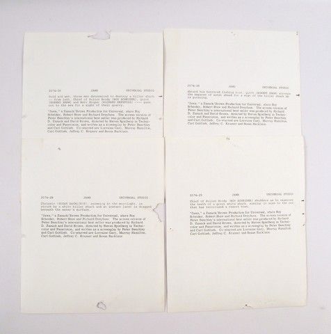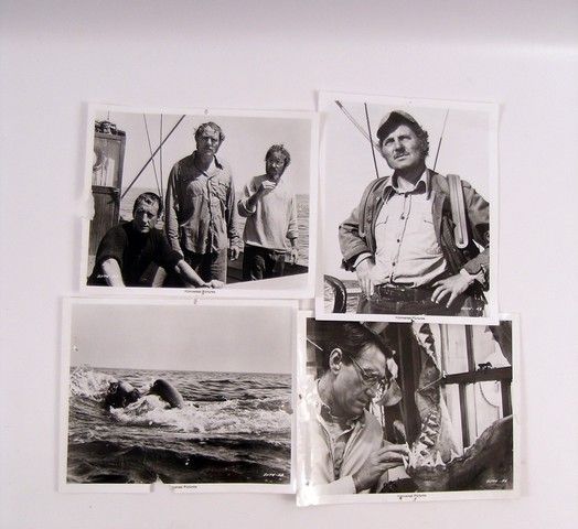 Four original production photos from the Universal Studios PR department to be sent out to the press. These B&W 8" x10" photos include the original Universal Studios text on the back of each photo. They include a photo of Roy Scheider, Robert Shaw and Richard Dreyfuss on the ill-fated boat; Quint (Robert Shaw) standing "alone" on the boat, looking for the killer shark; the iconic shot of Chrissie (Susan Backlinie) swimming naked in the moonlight at the beginning of the film, just as she is being dragged by the shark; and a close-up of Brody (Roy Scheider) examining the teeth of a great white, as he suddenly realizes what he's up against! Note that each photo has slight tears along the boarders of the prints.