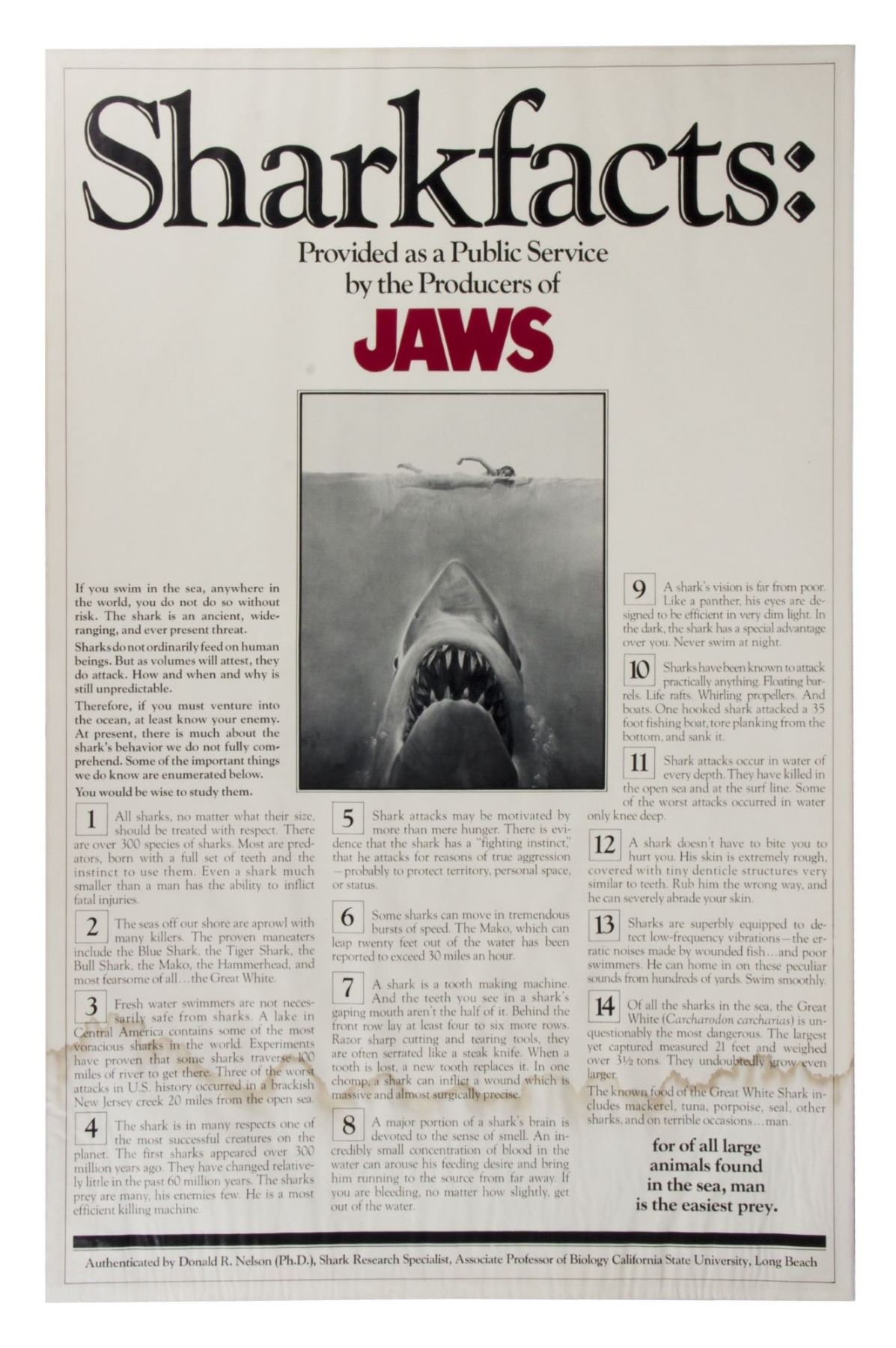 (Universal, 1975) A very rare "Sharkfacts" one sheet poster created in 1975 to promote the theatrical release of "Jaws". These posters are highly sought after as they were issued in much lower quantities than the standard one sheet. This poster comes from the collection of Bill Wallen, who helped create promotional and advertising campaigns for the film, including aiding in the creation of these posters. Measuring 40"x26.25", the poster is in poor to fair condition with some moisture staining to the bottom 9" of the poster, a few small tears around the edges, minor creasing throughout, and some age-toning to the paper.