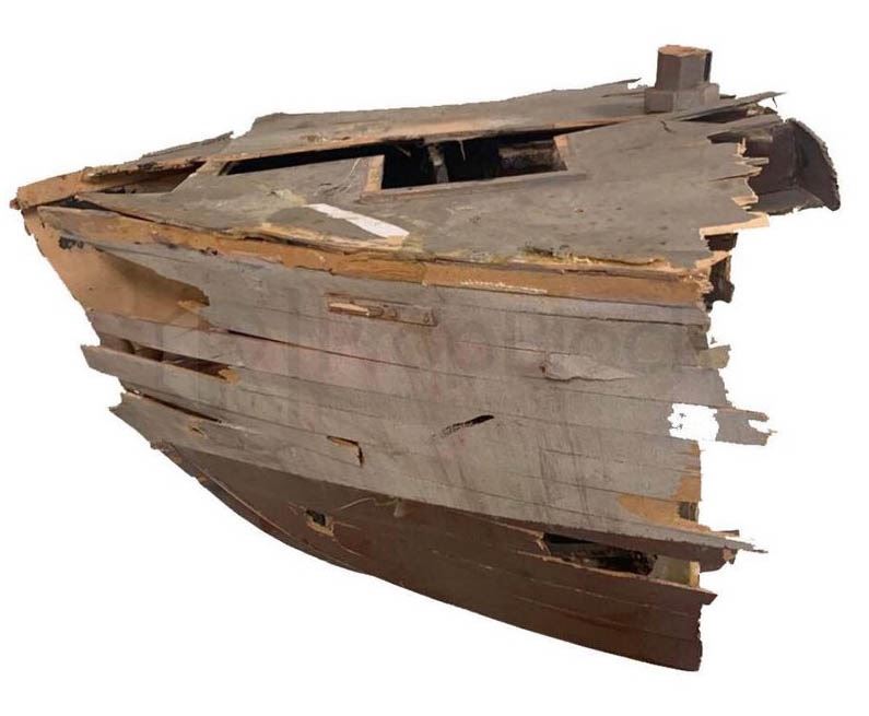 Miniature shipwrecked boat used in the production of the 1987 horror film Jaws: The Revenge. Chief Brody's widow believes that her family is deliberately being targeted by another shark in search of revenge. This piece is made of wood and was used in shots where a full sized boat shipwreck would not be needed. This piece remains in excellent, production used condition.