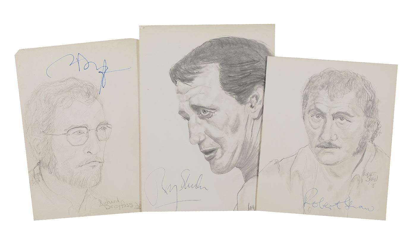 Original pencil sketches of Robert Shaw, Roy Scheider, and Richard Dreyfuss on individual off-white sheets, all done in a collector’s hand, signed in blue ballpoint by Shaw and Scheider, and in blue felt tip by Dreyfuss respectively. Some light edge creasing and toning, otherwise fine condition.