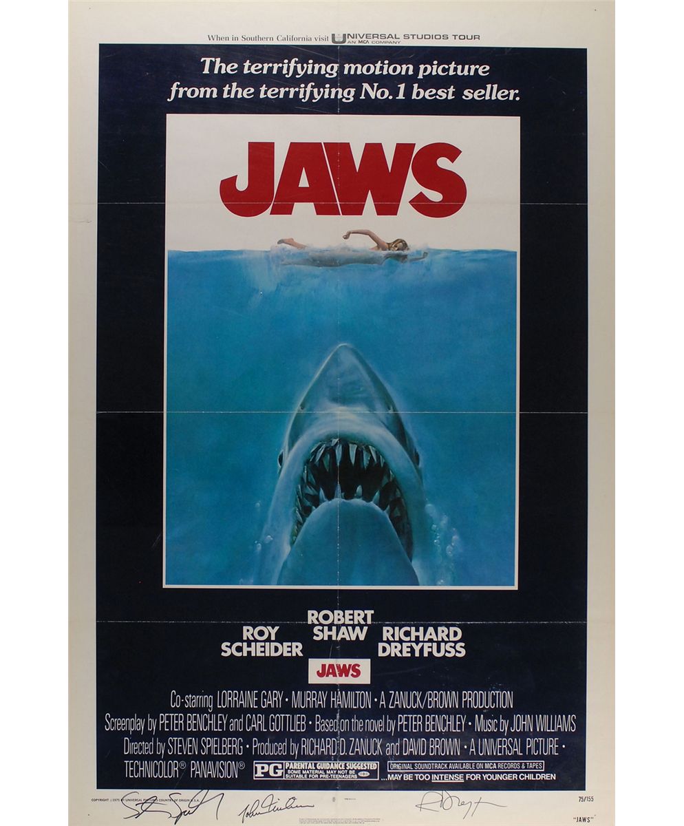 Color 27 x 41 one-sheet poster for the 1975 classic film Jaws, signed in black felt tip by Steven Spielberg and Richard Dreyfuss, with one additional signature in an unknown hand. In fine condition, with intersecting folds and some scattered light creases and wrinkles. Rolled. From the collection of noted publisher and founder of Lord John Press, Herb Yellin.