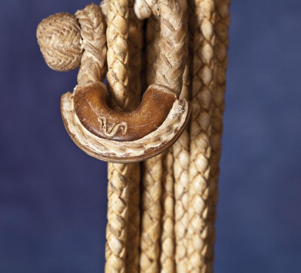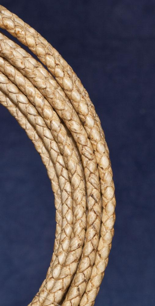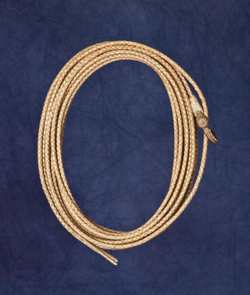 4 strand rawhide rope with tight button and hondo. Approx 40’, marked on hondo with the Adcock brand. Light color, tight braid, high quality as always from Jay. As new condition.