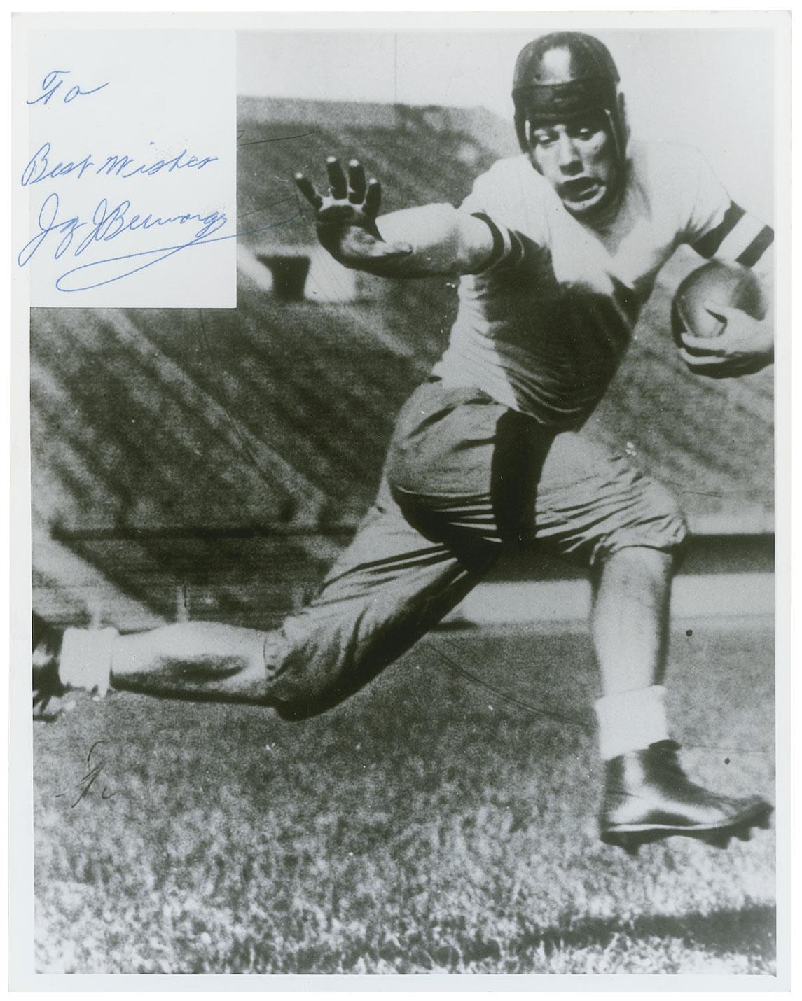 College Football Hall of Famer (1914–2002) and winner of the 1935 Heisman trophy. Satin-finish 8 x 10 photo of Berwanger running the ball, signed in a special blank area in the upper left in blue ballpoint, leaving room for an inscription. In fine condition.