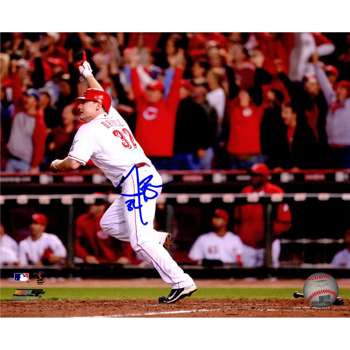 Jay Bruce signed Cincinnati Reds home run celebration action 8x10 photo. Item comes with a Schwartz Sports Memorabilia tamper-proof numbered hologram and Certificate of Authenticity which can be verified online.