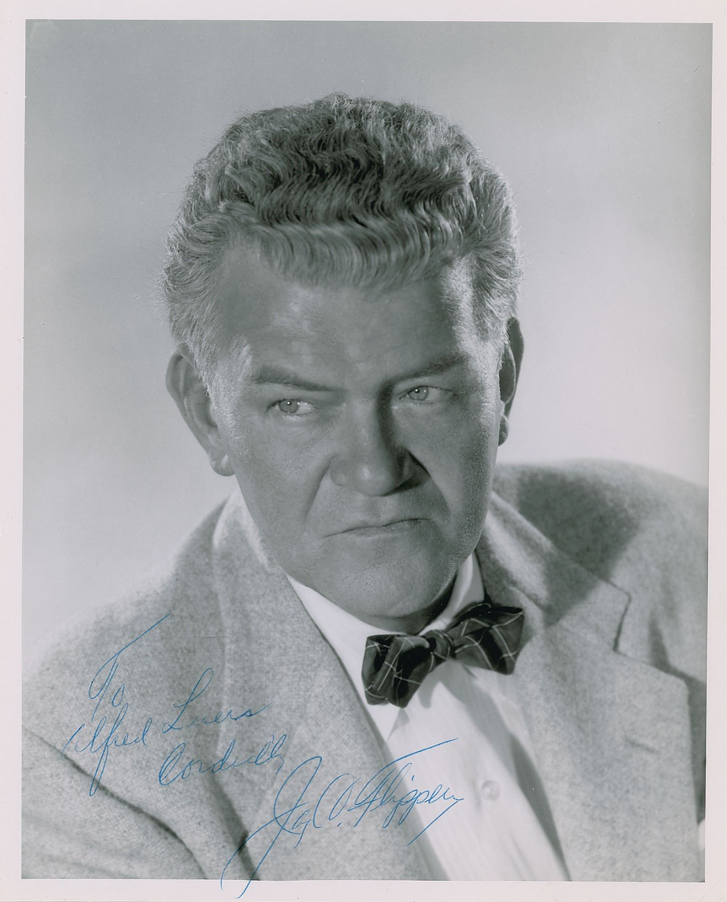 American character actor (1899–1971) who often played police officers or weary criminals in many films of the 1940s and 1950s. Vintage glossy 8 x 10 photo of Flippen with a serious look, signed and inscribed in blue ballpoint, "To Alfred Luers, Cordially, Jay C. Flippen.” Reverse bears a Gene Howard photography credit stamp. In fine condition.