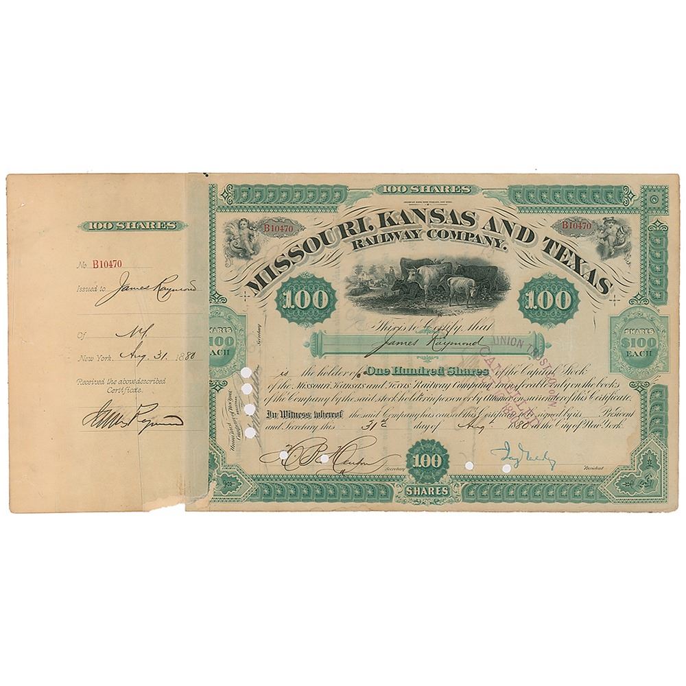 Partly-printed DS, one page, 11.5 x 8, August 31, 1880. Stock certificate issued to James Raymond for one hundred shares of capital stock in the Missouri, Kansas and Texas Railway Company. Signed at the conclusion by Jay Gould as the company's president, and countersigned by a secretary. The original receipt is affixed to the left edge. In fine condition, with some light edge staining, and minor surface loss to the lower left corner.