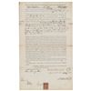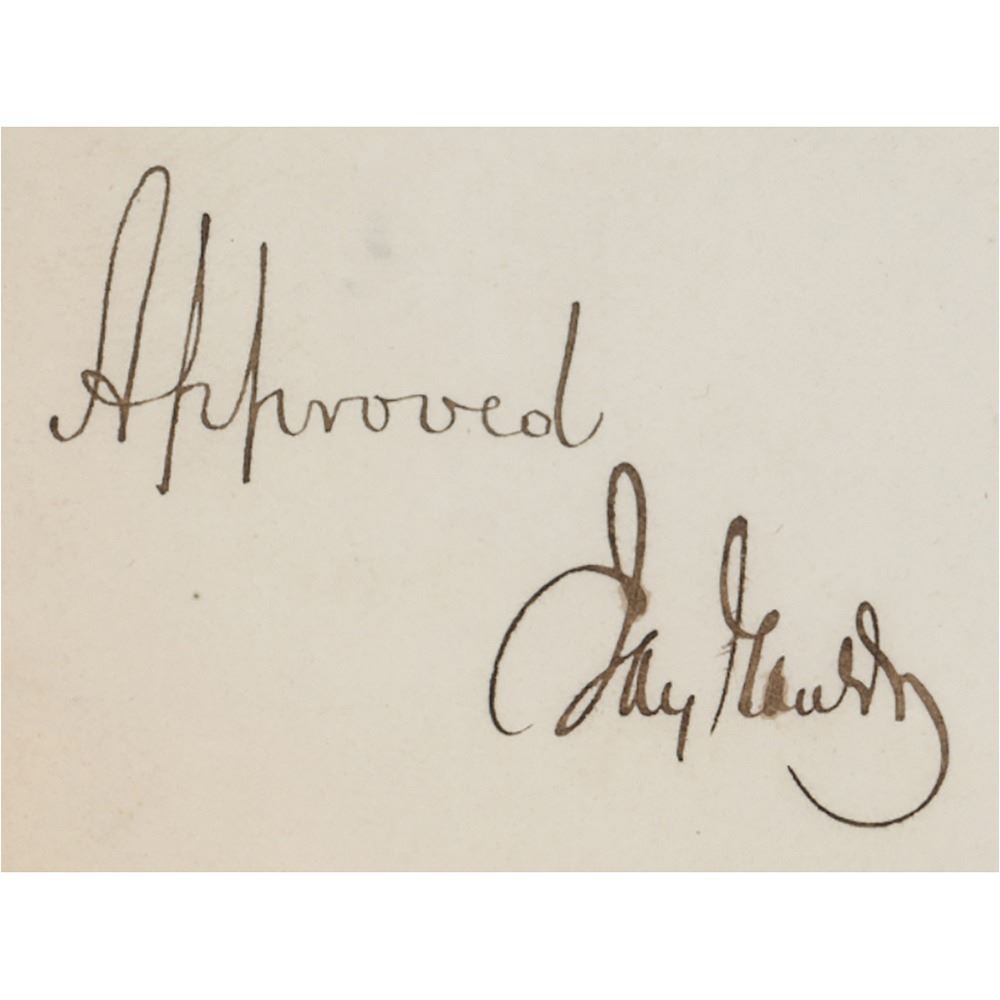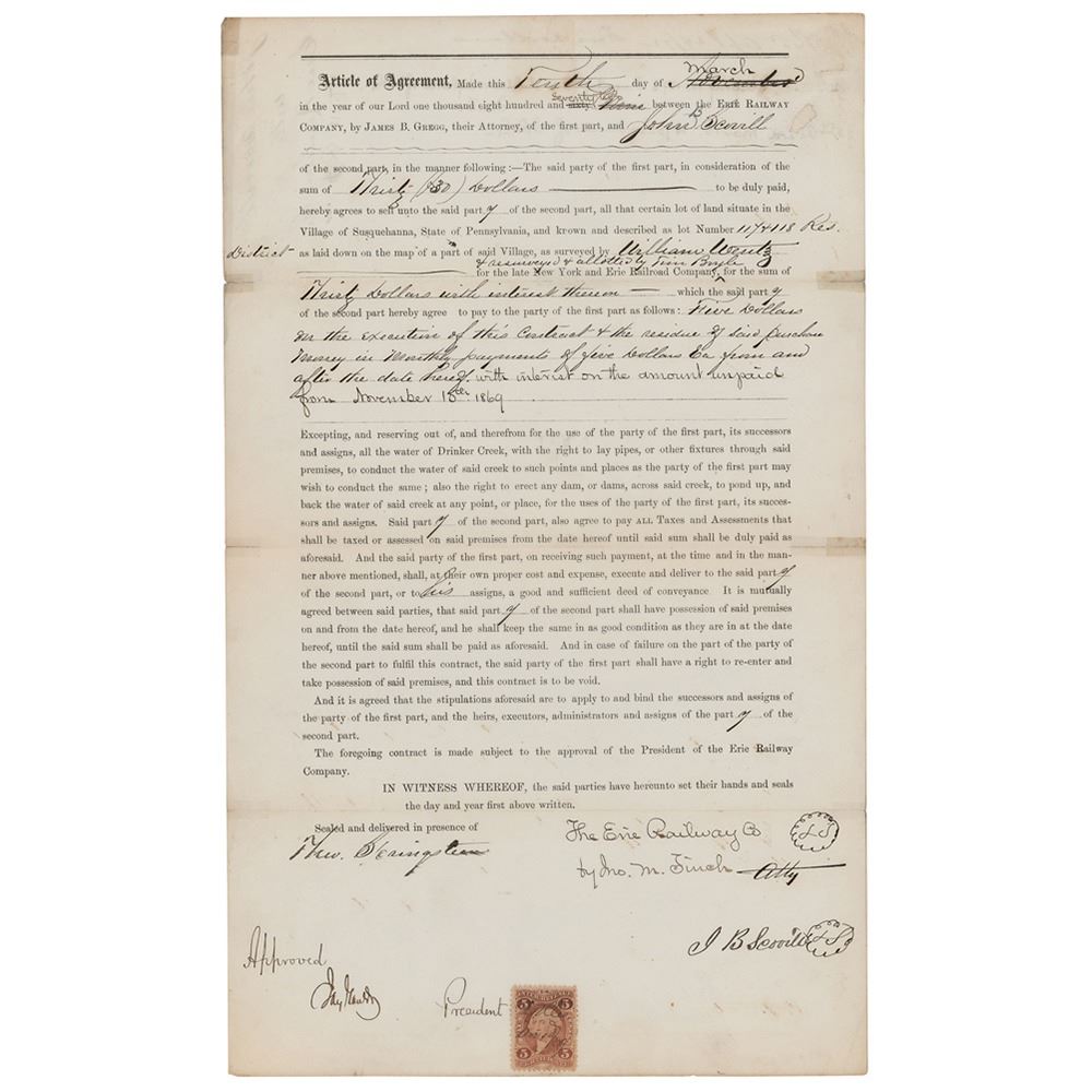 Partly-printed DS, one page, 8.5 x 14, March 10, 1872. An article of agreement made between the Erie Railway Company and John Scovill, regarding the sale of a "certain lot of land situate in the Village of Susquehanna, State of Pennsylvania" for the sum of $30. Signed at the conclusion by Jay Gould as the president of the Erie Railroad. In very good to fine condition, with small old tape repairs to the ends of fold splits. Following the Erie War of the 1860s, Gould claimed majority control of the company, but only for a short time. He was forced to relinquish control in 1872–73 due to unfavorable public opinion following his involvement in the 1869 gold-rigging scandal and to his loss of $1 million of Erie Railroad stock to the British con-man Lord Gordon-Gordon.