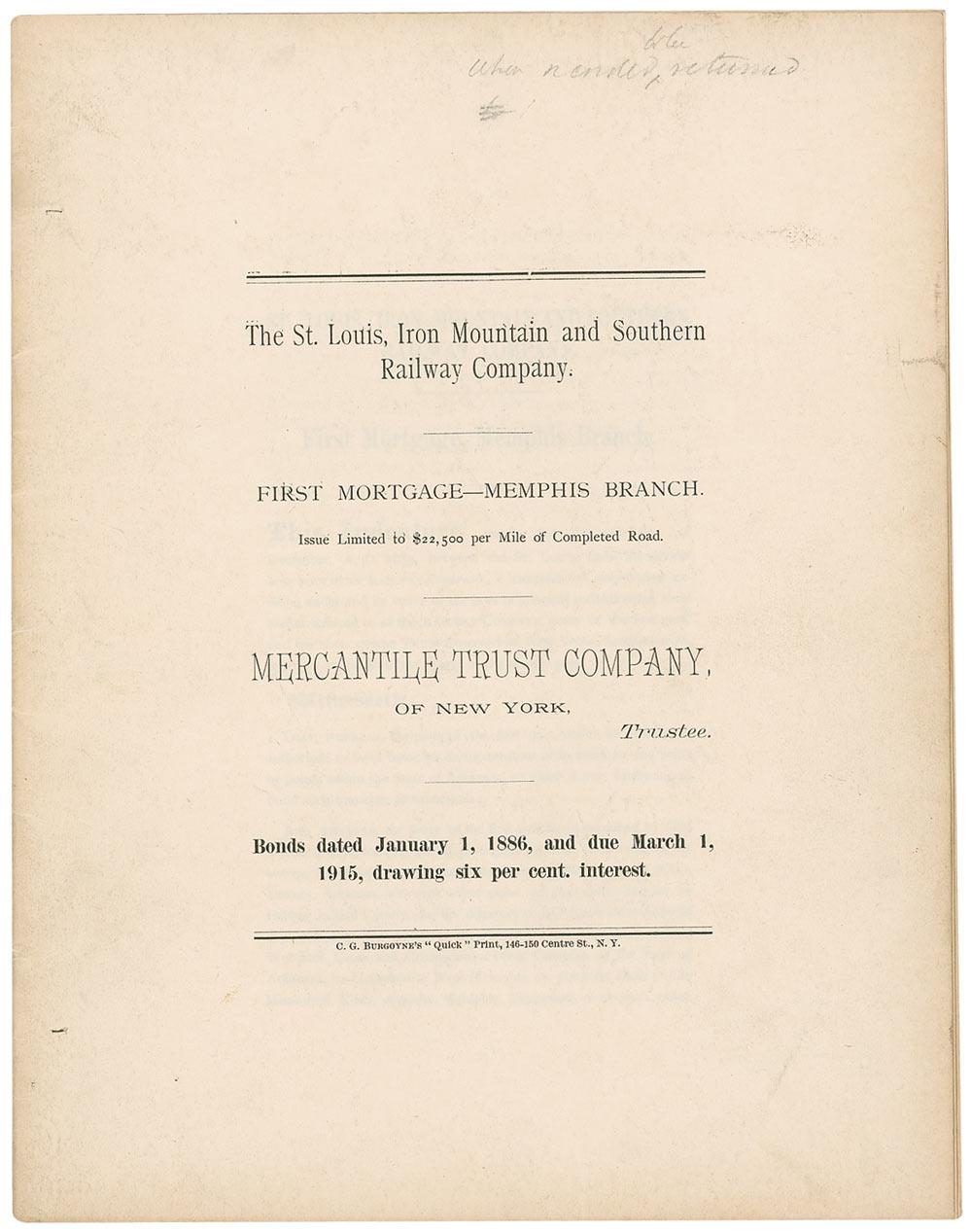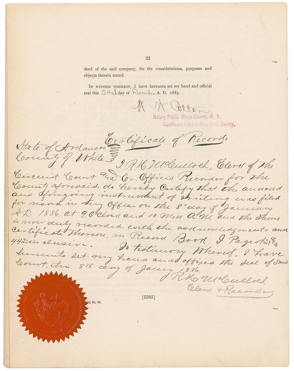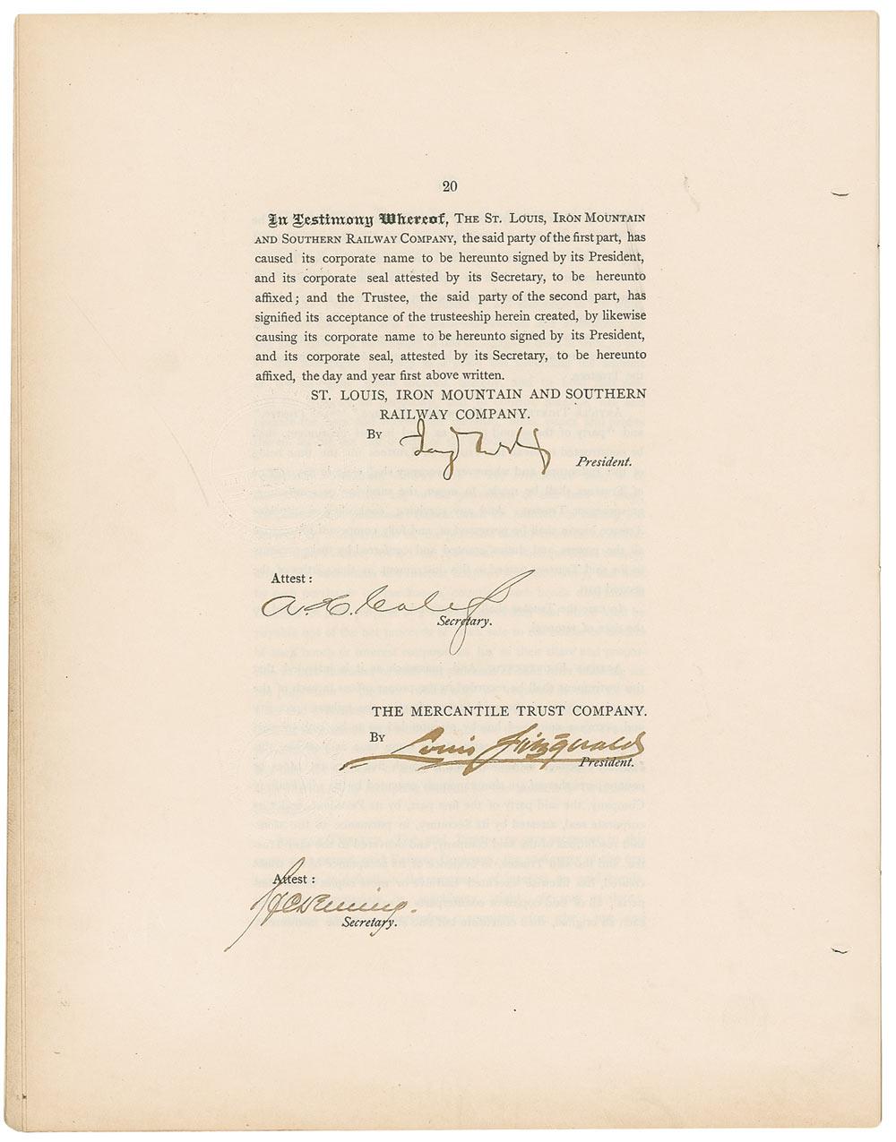 Financier (1836–1892) well known for his stock market manipulation of railroad securities; he also tried to corner the gold market, causing the ‘Black Friday’ stock market crash of September 1869. Historic DS, 24 pages, 8.5 x 11, December 15, 1885. A first mortgage bond to fund construction of the Memphis Branch of the St. Louis, Iron Mountain and Southern Railway Company. The Railway Company, in part, “has determined to build a branch of its road on the most eligible route to be determined by survey, extending from or near the town of Bald Knob, in White County, Arkansas, or such other point on the main line of its railway in said County, as the directors or Executive Committee of said company may select or approve, eastwardly through White, Woodruff, Cross and Crittenden or other Counties, in the State of Arkansas, to Hopefield or West Memphis, on the west bank of the Mississippi River, opposite Memphis, Tennessee, or to such other point in Crittenden County as the said Railway Company may select or approve, which said branch is hereinafter called the Memphis Branch…” Signed on page 20 by Gould as the company’s president, and also countersigned by Louis Fitzgerald as President of the Mercantile Trust Company and two witnesses. A signed statement of Notary Public W. W. Norton is on pages 21-22, followed on pages 22-24 by four manuscript statements and embossed seals of the clerks of White, Woodruff, Cross, and Crittenden counties, Arkansas. In fine condition, with scattered soiling and creases to covers, and a mild central vertical crease to all pages.