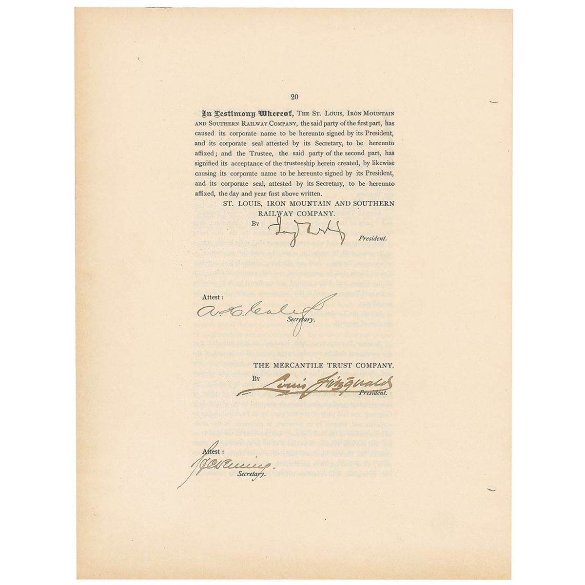 Historic DS, 24 pages, 8.5 x 11, December 15, 1885. A first mortgage bond to fund construction of the Memphis Branch of the St. Louis, Iron Mountain and Southern Railway Company. The Railway Company, in part, “has determined to build a branch of its road on the most eligible route to be determined by survey, extending from or near the town of Bald Knob, in White County, Arkansas, or such other point on the main line of its railway in said County, as the directors or Executive Committee of said company may select or approve, eastwardly through White, Woodruff, Cross and Crittenden or other Counties, in the State of Arkansas, to Hopefield or West Memphis, on the west bank of the Mississippi River, opposite Memphis, Tennessee, or to such other point in Crittenden County as the said Railway Company may select or approve, which said branch is hereinafter called the Memphis Branch…” Signed on page 20 by Gould as the company’s president, and also countersigned by Louis Fitzgerald as President of the Mercantile Trust Company and two witnesses. A signed statement of Notary Public W. W. Norton is on pages 21–22, followed on pages 22–24 by four manuscript statements and embossed seals of the clerks of White, Woodruff, Cross, and Crittenden counties, Arkansas. In fine condition, with scattered soiling and creases to covers, and a mild central vertical crease to all pages.