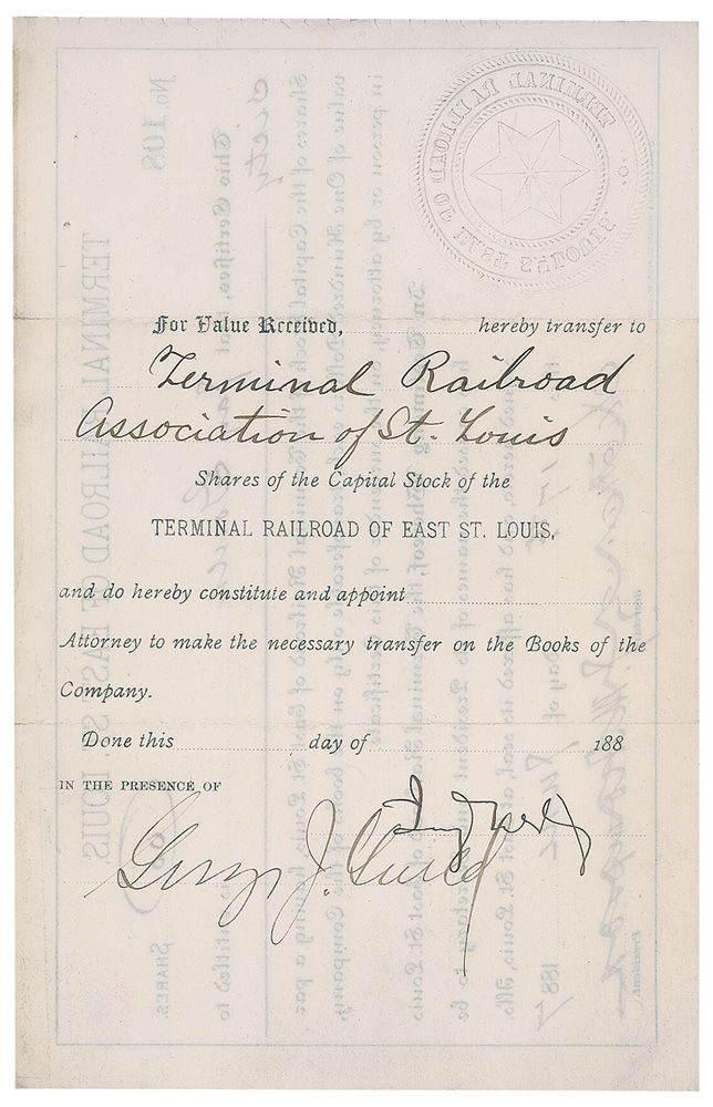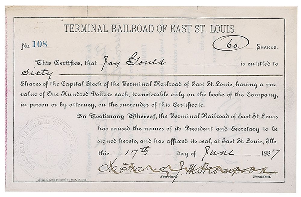 Financier known for his stock market manipulation of railroad securities; he also tried to corner the gold market, causing the ‘Black Friday’ stock market crash of September 1869. Partly-printed DS, signed “Jay Gould,” one page both sides, 8 x 5, June 17, 1887. Certificate for shares in the Terminal Railroad of East St. Louis. In part: “This Certifies, that Jay Gould is entitled to sixty Shares of the Capital Stock of the Terminal Railroad of East St. Louis, having a par value of One Hundred Dollars each.” Intersecting folds, some wrinkles, and show-through from text on opposing sides, otherwise fine condition.