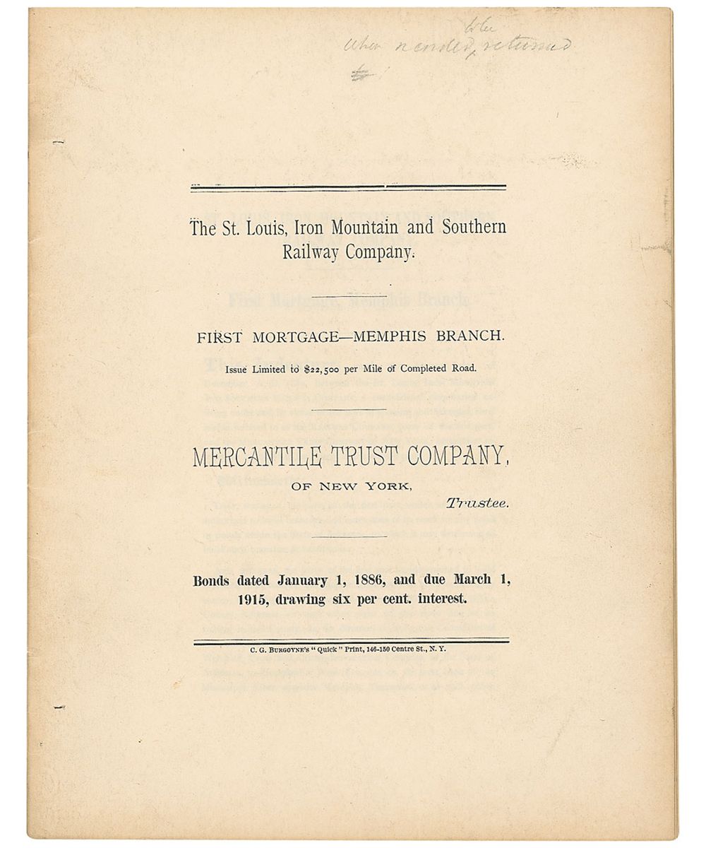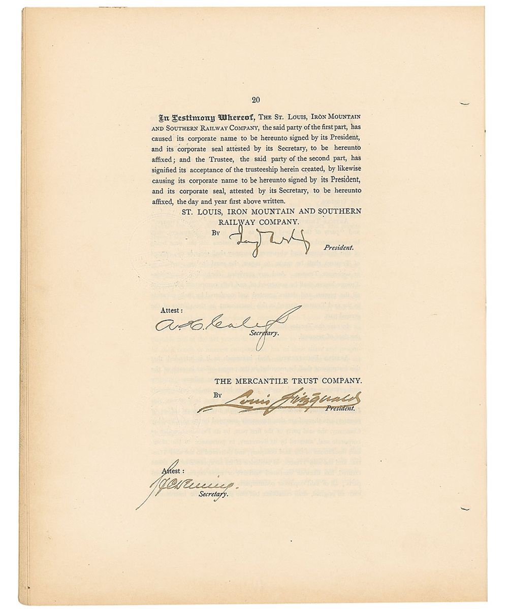 Historic DS, 24 pages, 8.5 x 11, December 15, 1885. A first mortgage bond to fund construction of the Memphis Branch of the St. Louis, Iron Mountain and Southern Railway Company. The Railway Company, in part, “has determined to build a branch of its road on the most eligible route to be determined by survey, extending from or near the town of Bald Knob, in White County, Arkansas, or such other point on the main line of its railway in said County, as the directors or Executive Committee of said company may select or approve, eastwardly through White, Woodruff, Cross and Crittenden or other Counties, in the State of Arkansas, to Hopefield or West Memphis, on the west bank of the Mississippi River, opposite Memphis, Tennessee, or to such other point in Crittenden County as the said Railway Company may select or approve, which said branch is hereinafter called the Memphis Branch.” Signed on page 20 by Gould as the company’s president, and also countersigned by Louis Fitzgerald as president of the Mercantile Trust Company and two witnesses. A signed statement of Notary Public W. W. Norton is on pages 21–22, followed on pages 22–24 by four manuscript statements and embossed seals of the clerks of White, Woodruff, Cross, and Crittenden counties, Arkansas. In fine condition, with scattered light soiling and creases to covers, and a mild central vertical crease to all pages.