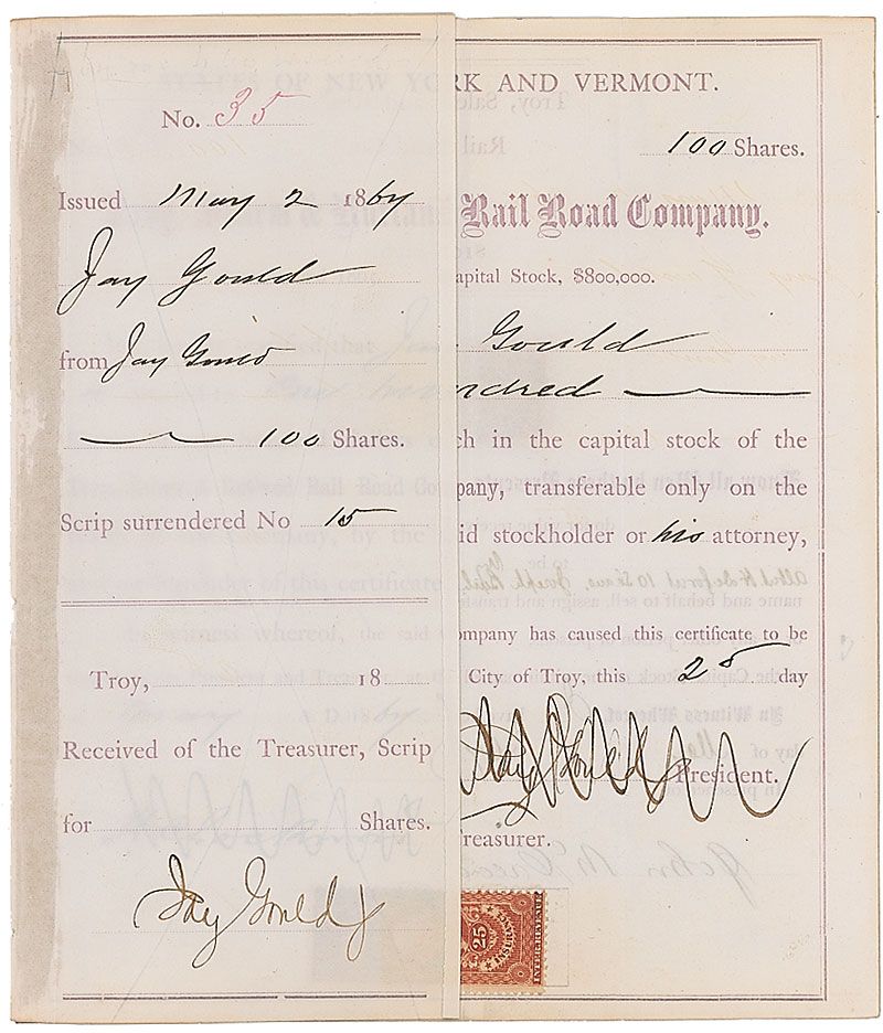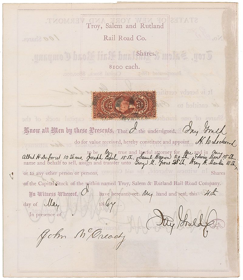 Financier well known for his stock market manipulation of railroad securities; he also tried to corner the gold market, causing the ‘Black Friday’ stock market crash of September 1869. Partly-printed DS one page both sides, 7 x 8.25, May 2, 1867. Stock certificate from the Troy, Salem, and Rutland Rail Road Company for 100 shares issued to Gould. Signed at the bottom by Gould as the company’s president. A 3.5 x 8.25 receipt is affixed to the front of the certificate. In very good condition, with ink cancellation through signature, two revenue stamps affixed to document, and intersecting folds, one through a single letter of signature.