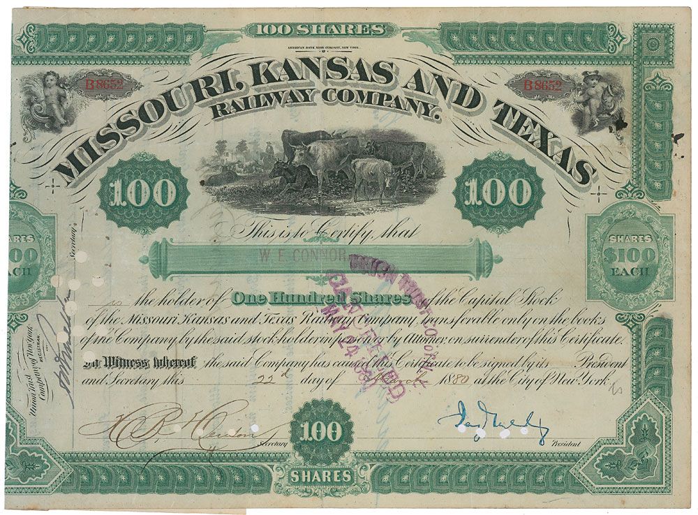 Financier (1836–1892) known for his stock market manipulation of railroad securities; he also tried to corner the gold market, causing the ‘Black Friday’ stock market crash of September 1869. Partly-printed DS, one page, 14.5 x 7.75, March 22, 1880. Stock certificate for 100 shares of capital stock of the Missouri, Kansas and Texas Railway Company issued to W. E. Connor, signed at the conclusion by Gould as the company’s president. The receipt is affixed to the left edge of the certificate. In very good condition, with intersecting folds (some passing through signatures) and various cancellation stamps and holes (three holes affecting bottom of signature).