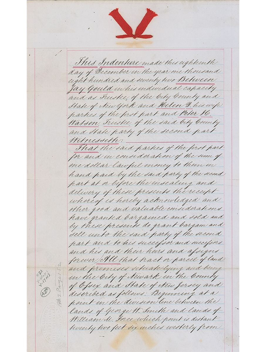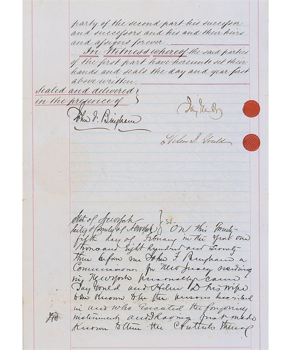 Financier (1836–1892) known for his stock market manipulation of railroad securities; he also tried to corner the gold market, causing the ‘Black Friday’ stock market crash of September 1869. Manuscript DS, seven sides of four pages, 8.5 x 14, December 18, 1872. Lengthy indenture document between Gould and Peter H. Watson transferring ownership of two tracts of land in New Jersey. Signed on the reverse of the third by Jay Gould as well as his wife, Helen D. Gould. Pages are bound with their original red ribbon at the top. In fine condition, with expected document wear, a bit of scattered toning, and a couple of small edge tears.