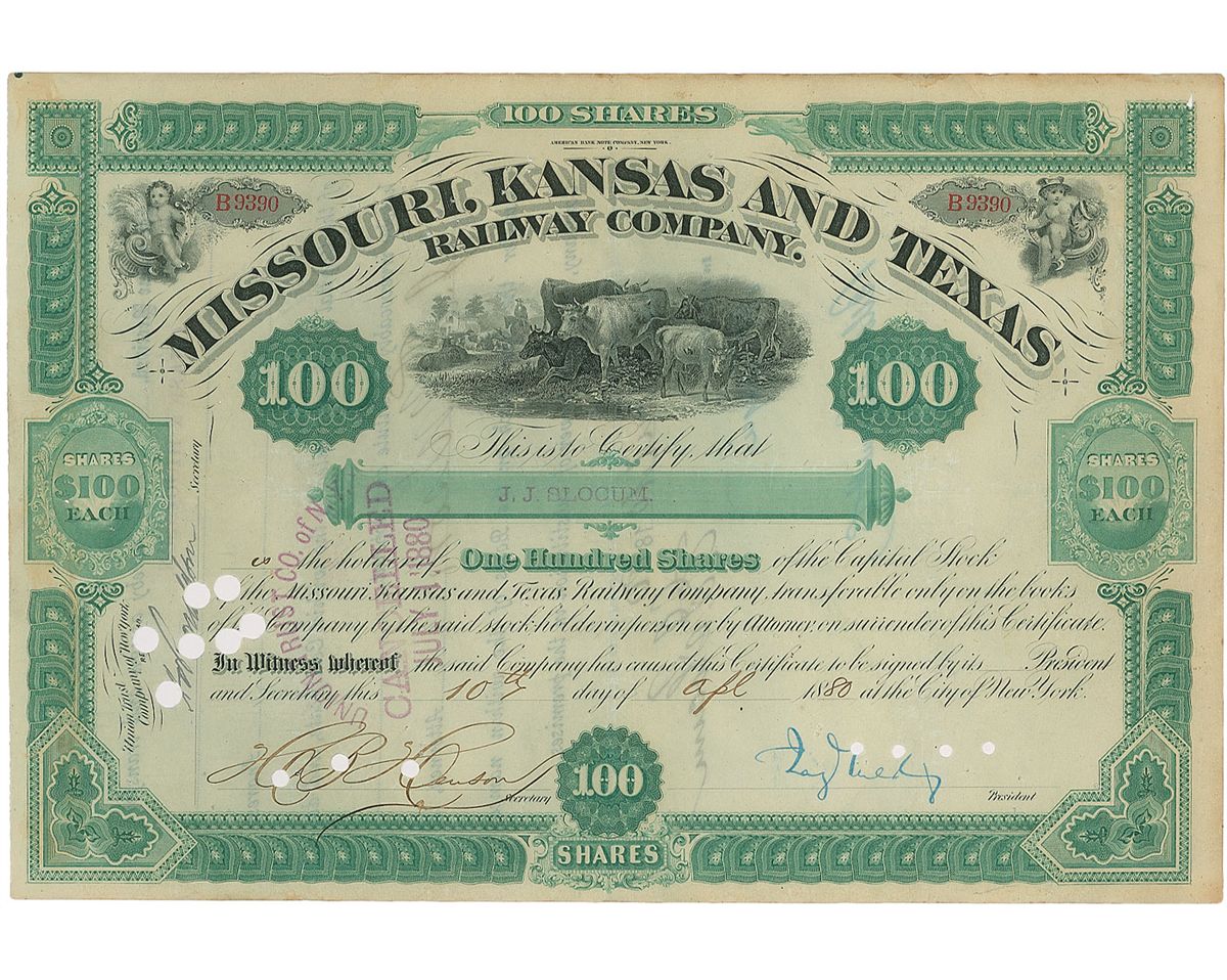Financier (1836–1892) known for his stock market manipulation of railroad securities; he also tried to corner the gold market, causing the ‘Black Friday’ stock market crash of September 1869. Partly-printed DS, one page, 11.5 x 7.25, April 10, 1880. Stock certificate for 100 shares in the Missouri, Kansas and Texas Railway Company issued to J. J. Slocum. Signed at the conclusion by Gould as president of the company. Overall creases and expected document wear, and scattered cancellation holes (affecting one letter of Gould’s signature), otherwise fine condition.
