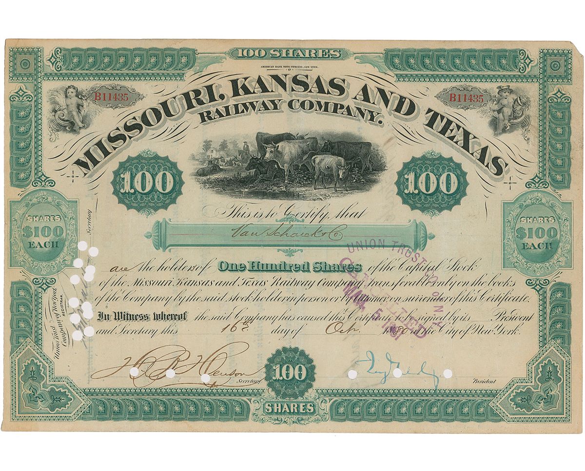 Financier (1836–1892) known for his stock market manipulation of railroad securities; he also tried to corner the gold market, leading to the ‘Black Friday’ stock market crash of September 1869. Partly-printed DS, one page, 11.5 x 7.75, October 16, 1880. Stock certificate for 100 shares of the Missouri, Kansas and Texas Railway Company, signed at the conclusion by Gould as its president. In very good condition, with intersecting folds, scattered creases, cancellation holes (one affecting his last name) and pinholes throughout, a cancellation stamp, and other expected document wear.