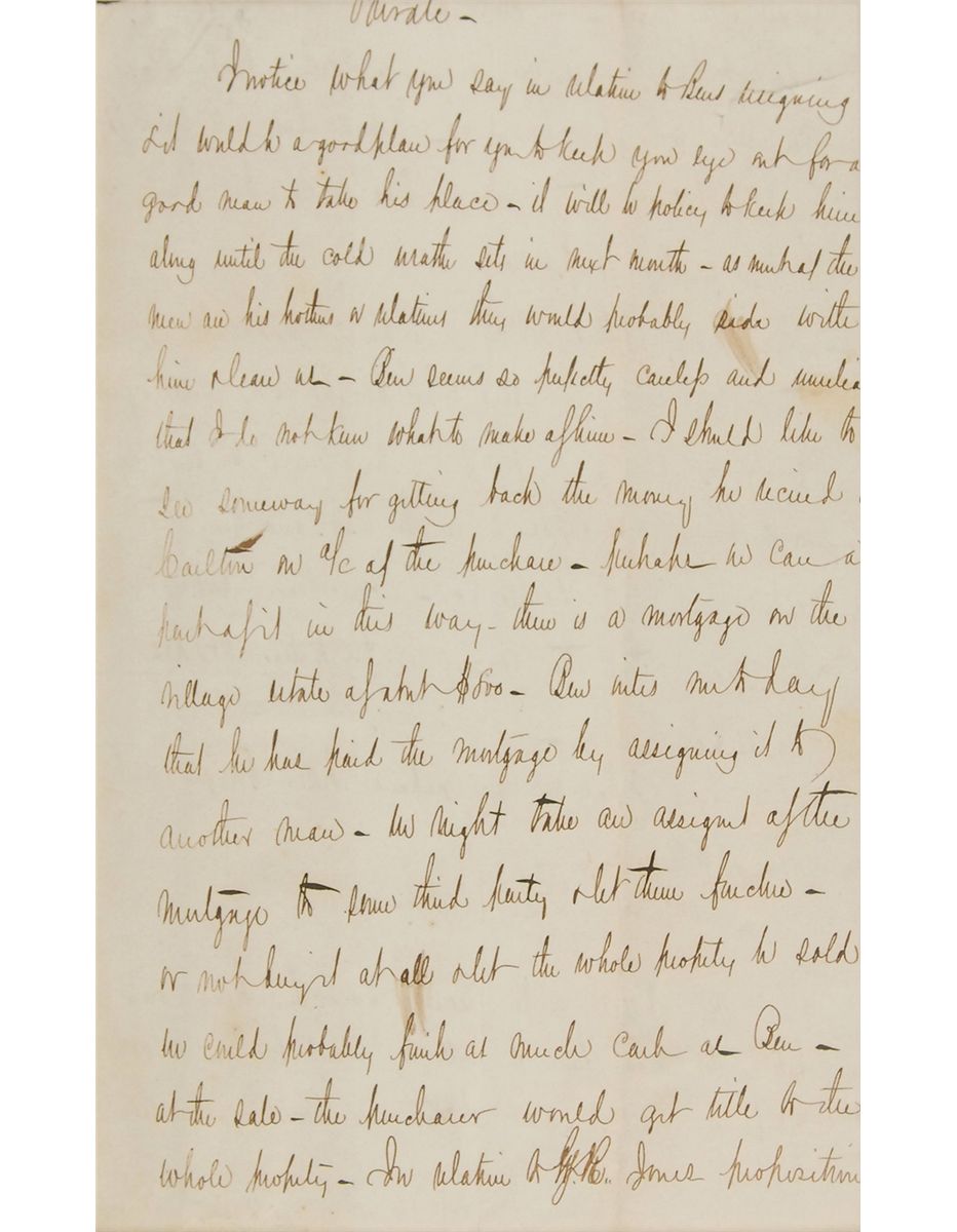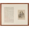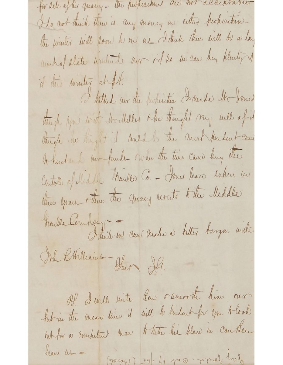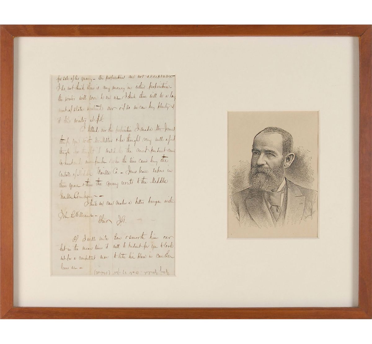 ALS signed “J. G.,” one page both sides, 4.75 x 7.75, October 17, 1865. Letter discussing financial matters regarding a slate quarry in Middle Granville, New York. In part: “I notice what you say in relation to Ben…& it would be a good plan for you to keep your eye out for a good man to take his place—it will be policy to keep him along until the cold weather sets in next month…Ben seems so perfectly careless…I do not know what to make of him—I should like to see some way for getting back the money he received…In relation to…Jones proposition for sale of his quarry…I do not think there is any money…I think we can make a better bargain with John R. Williams.” Matted and framed with an engraved portrait of Gould to an overall size of 14.5 x 11.75, with a window on the reverse for viewing the first page. Intersecting folds and a tear near the top affecting a few words, otherwise fine condition. Gould held interests in several businesses in this area, including investments in rail services for shipping. Slate had been discovered in 1850 near Middle Granville, and William R. Williams opened the first quarry in 1852; he was soon joined by his brother John R. Willliams to expand the commercial operation. Desirable business content from the archetypal ‘robber baron.’