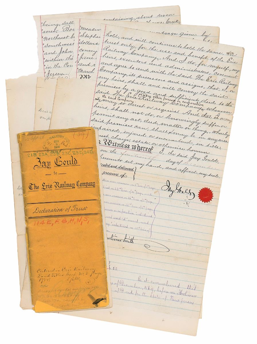Financier (1836–1892) known for his stock market manipulation of railroad securities; he also tried to corner the gold market, leading to the ‘Black Friday’ stock market crash of September 1869. Manuscript DS, three pages both sides, 8.5 x 14, December 14, 1869. Deed of trust to the Erie Railway Company for several parcels of land purchased by Gould in the New Jersey Meadowlands, including a tract “Bounded Northwest by Pen Horne Creek, northeast by a ditch, southeast by the Railroad.” Boldly signed at the conclusion by Gould beside an affixed red seal. In very good condition, with expected document wear, scattered soiling, and a large area of paper loss to one corner. Accompanied by an additional related page and original folder.
