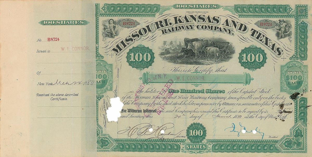 Financier (1836–1892) known for his stock market manipulation of railroad securities; he also tried to corner the gold market, leading to the ‘Black Friday’ stock market crash of September 1869. Partly-printed DS, one page, 11.5 x 8, March 24, 1880. Stock certificate issued to W. E. Connor for one hundred shares of capital stock in the Missouri, Kansas and Texas Railway Company. Signed at the conclusion by Gould as the company’s president and countersigned by a secretary. The original receipt is affixed to the left edge. In fine condition, with expected cancellation punch holes touching his signature and a larger area of punched cancellation to the left edge.
