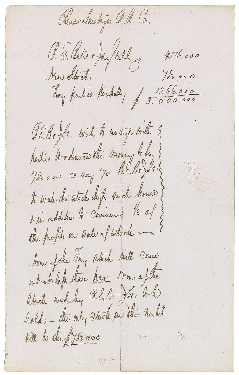 Ink notations on an off-white 5 x 8 sheet of Reed, Po'Keepsie letterhead, written entirely in the hand of Gould, who signs in the third person and thrice adds his initials. Headed "Rensr. Saratoga R. R. Co.," the sheet features the transaction details of Gould and partner Benjamin E. Bates in relation to the purchase of $780,000 worth of stocks. In fine condition, with a light diagonal crease.