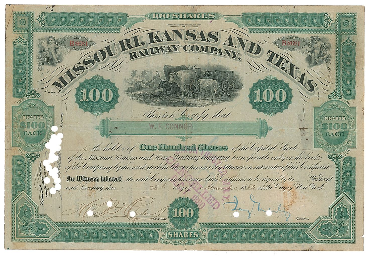 Partly-printed DS, one page, 11.5 x 7.75, March 23, 1880. Stock certificate issued to W. E. Connor for one hundred shares of capital stock in the Missouri, Kansas and Texas Railway Company. Signed at the conclusion by Jay Gould as the company's president, and countersigned by a secretary. In very good condition, with overall creasing, and light staining and toning.