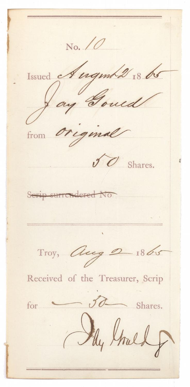 Received of the treasurer, Scrip, for ` 50` shares. Signed by Jay Gould. Stub Aug 2, 1865 3 3/4" x 8 1/4"